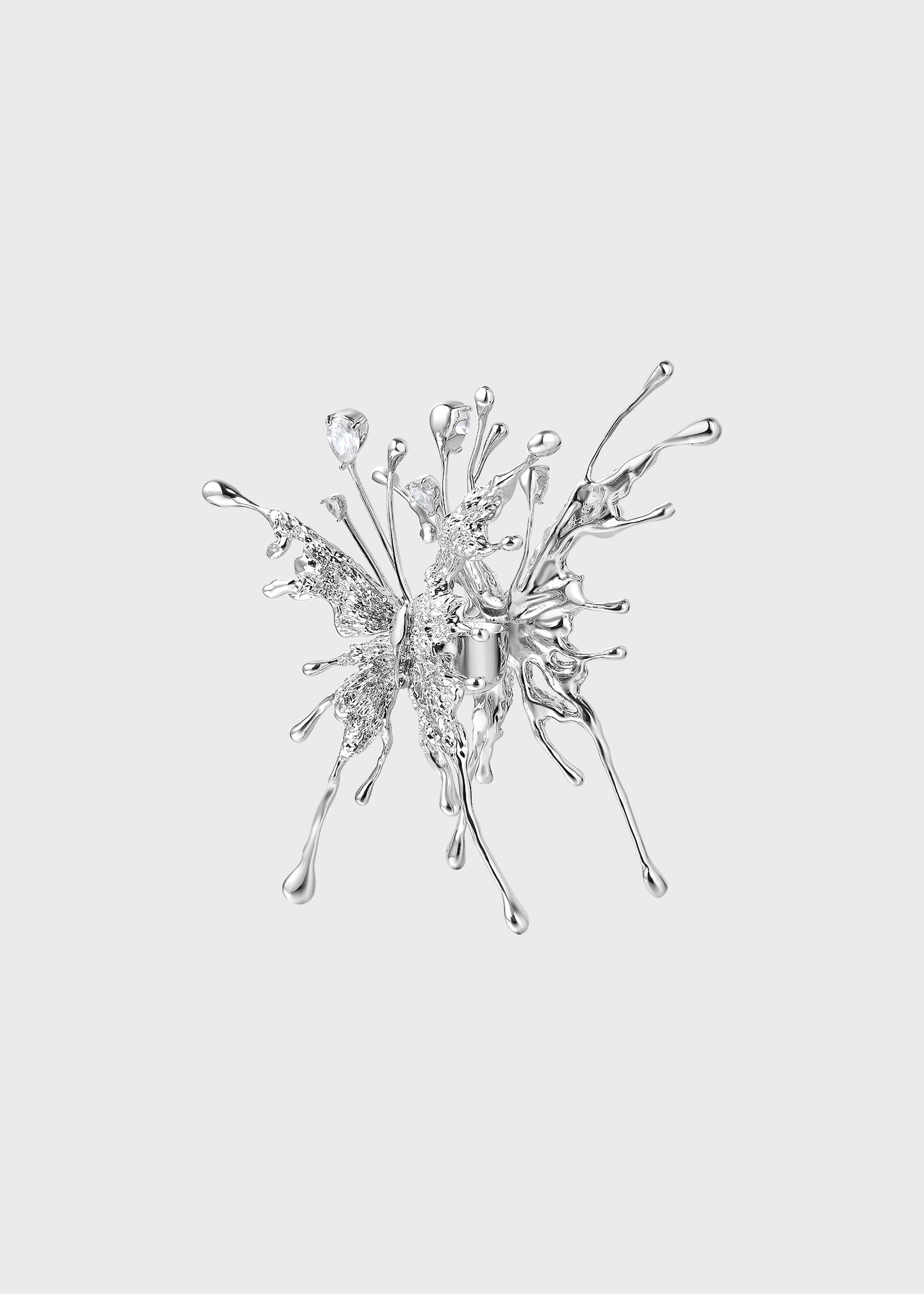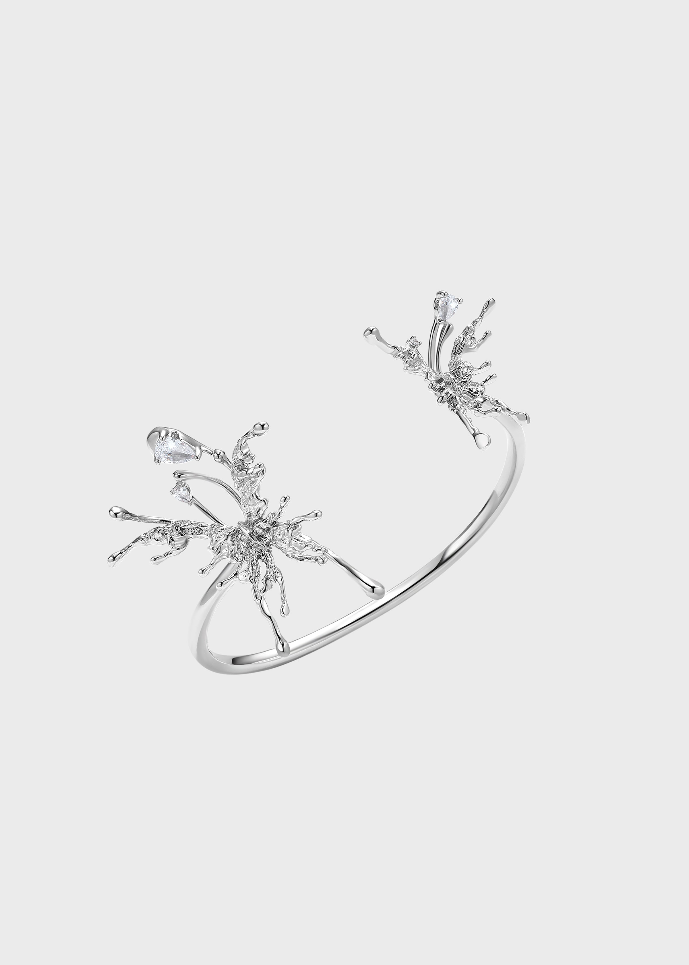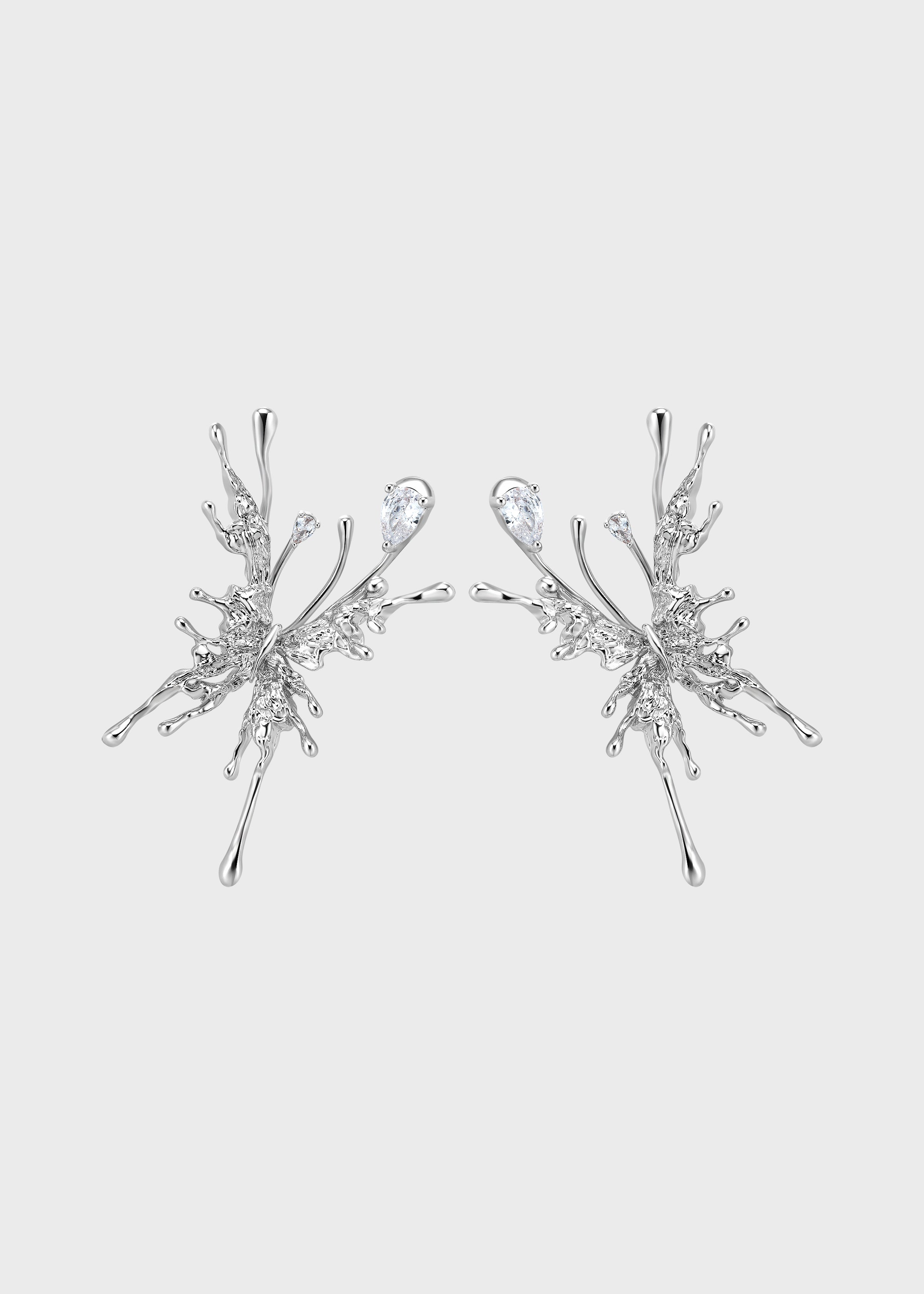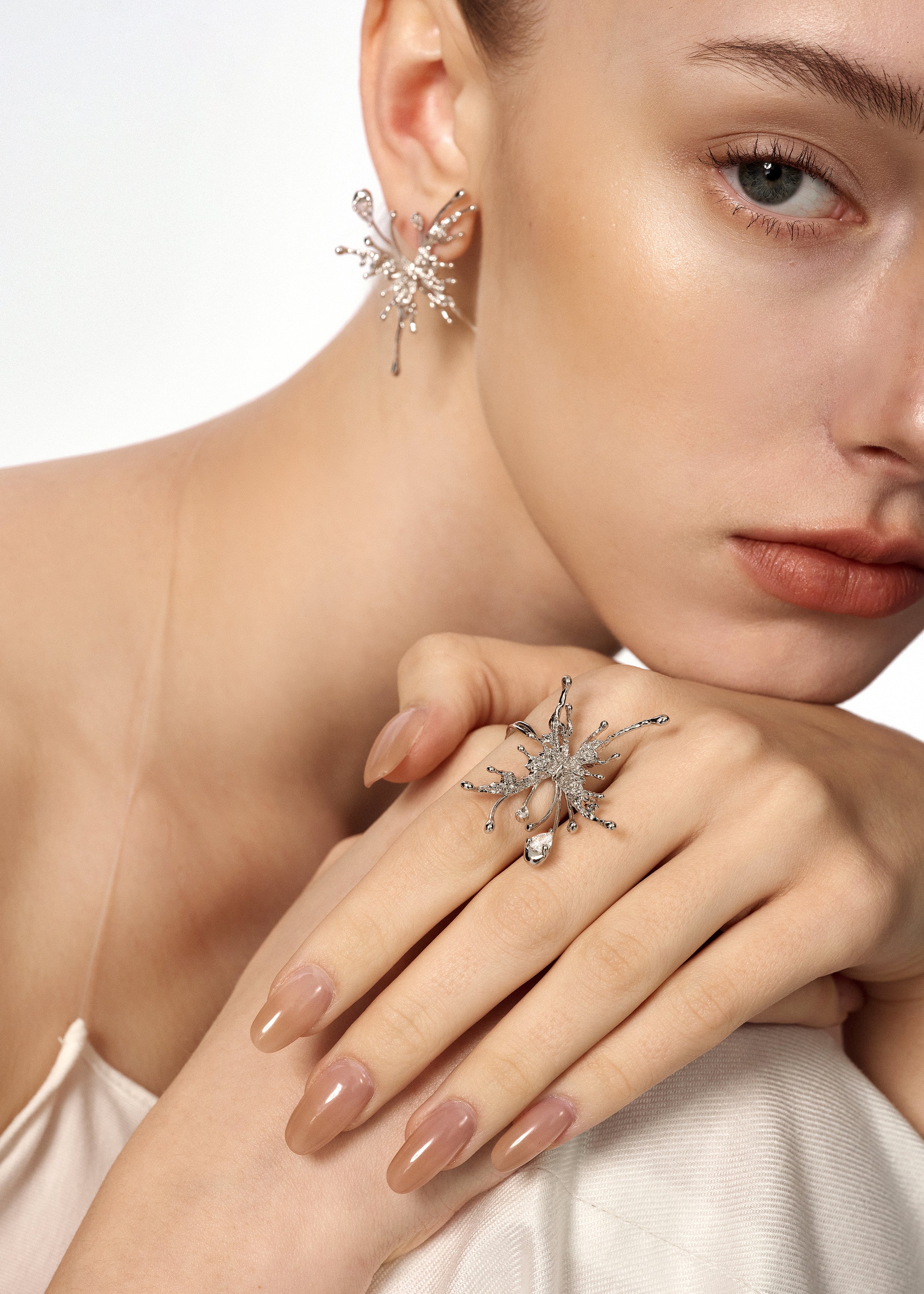 This collection captures delicate wings in sculptural forms, accented with shimmering stones that move with light.