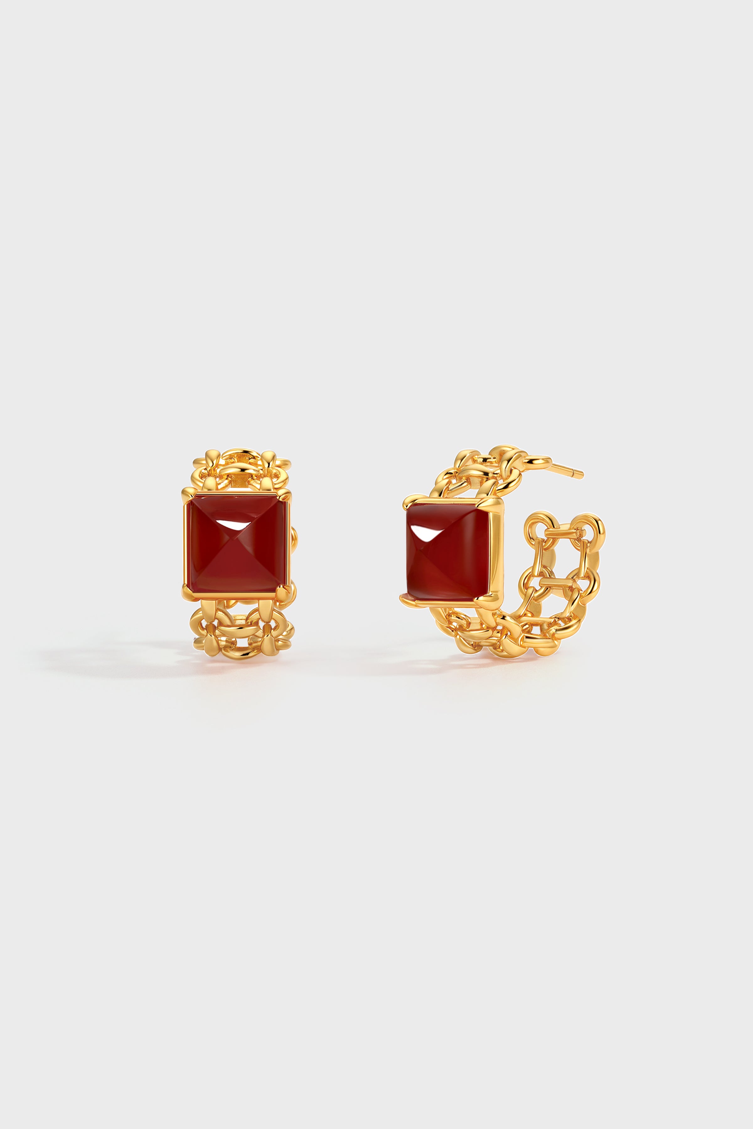 Sugar Pyramid Red Agate: The centerpiece features a custom-made pyramid-cut square red agate, a shape not available in standard market cuts. Combined with the woven chain circle, it creates a boutique, eye-catching design with strong visual character.