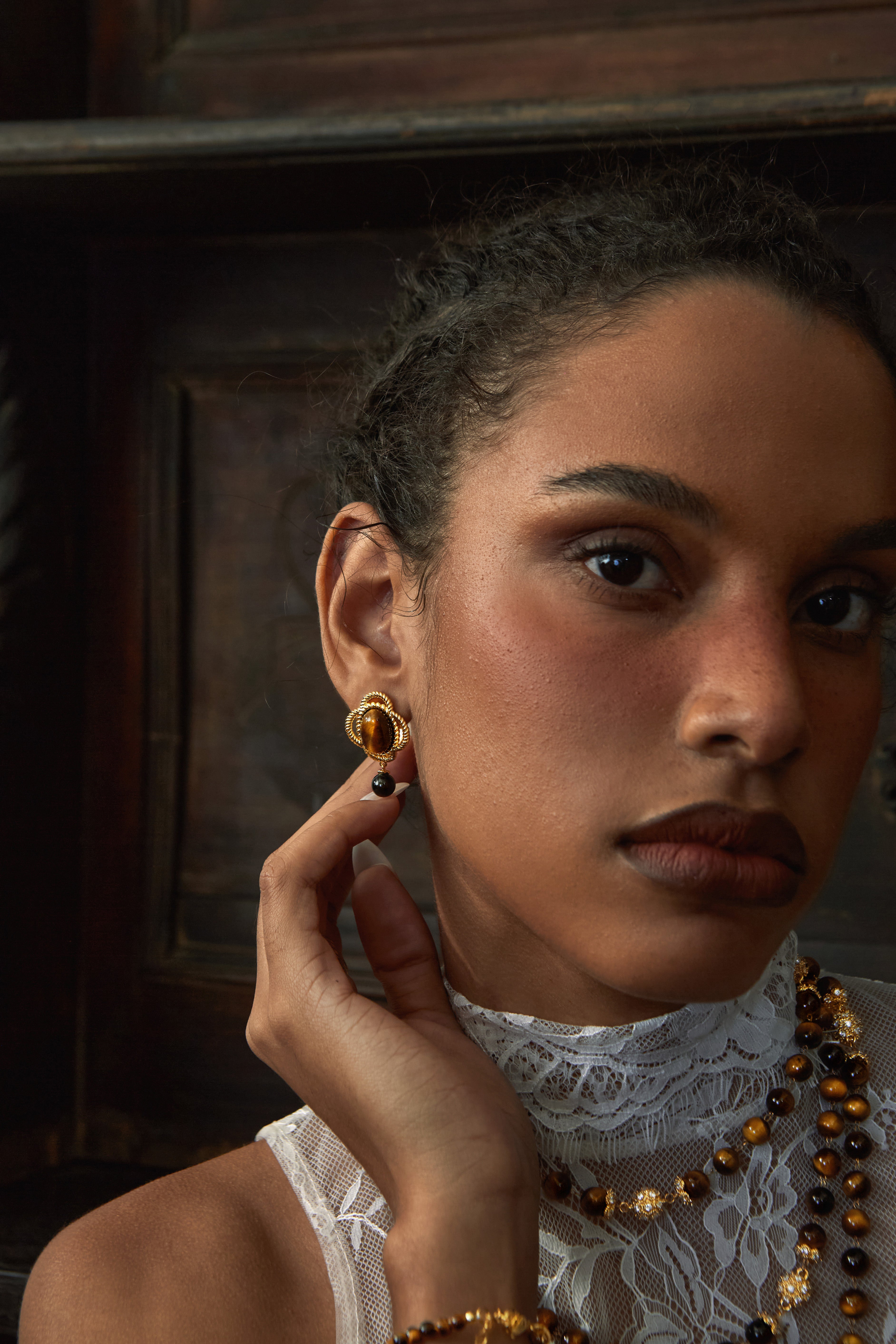Rooted in the Maillard-inspired color palette, this design fuses the brown-golden gradient of Tiger Eye with Black Onyx and a liquid gold sheen — creating a warm, grounded yet dynamic vintage jewelry piece for fall and winter.