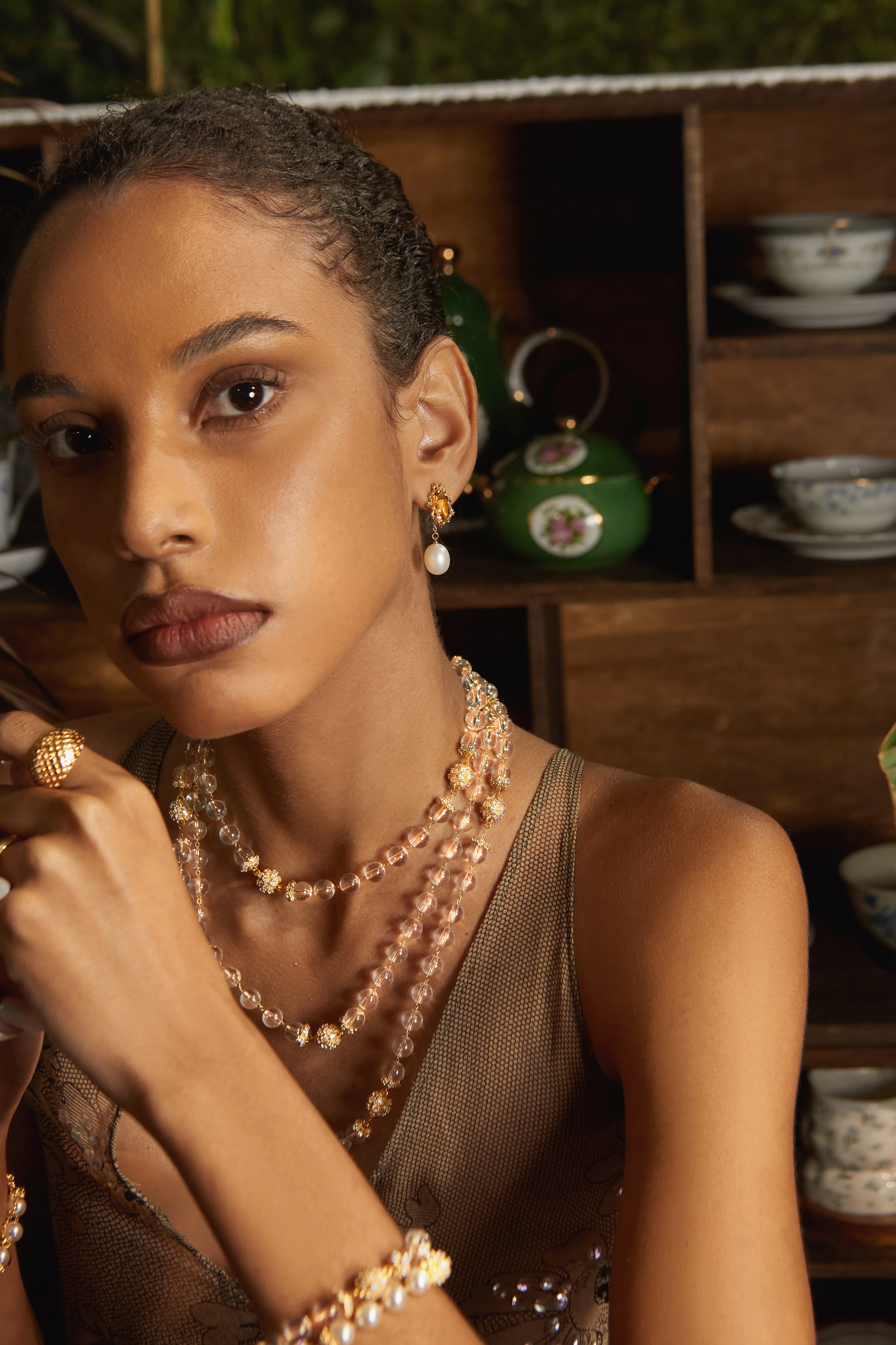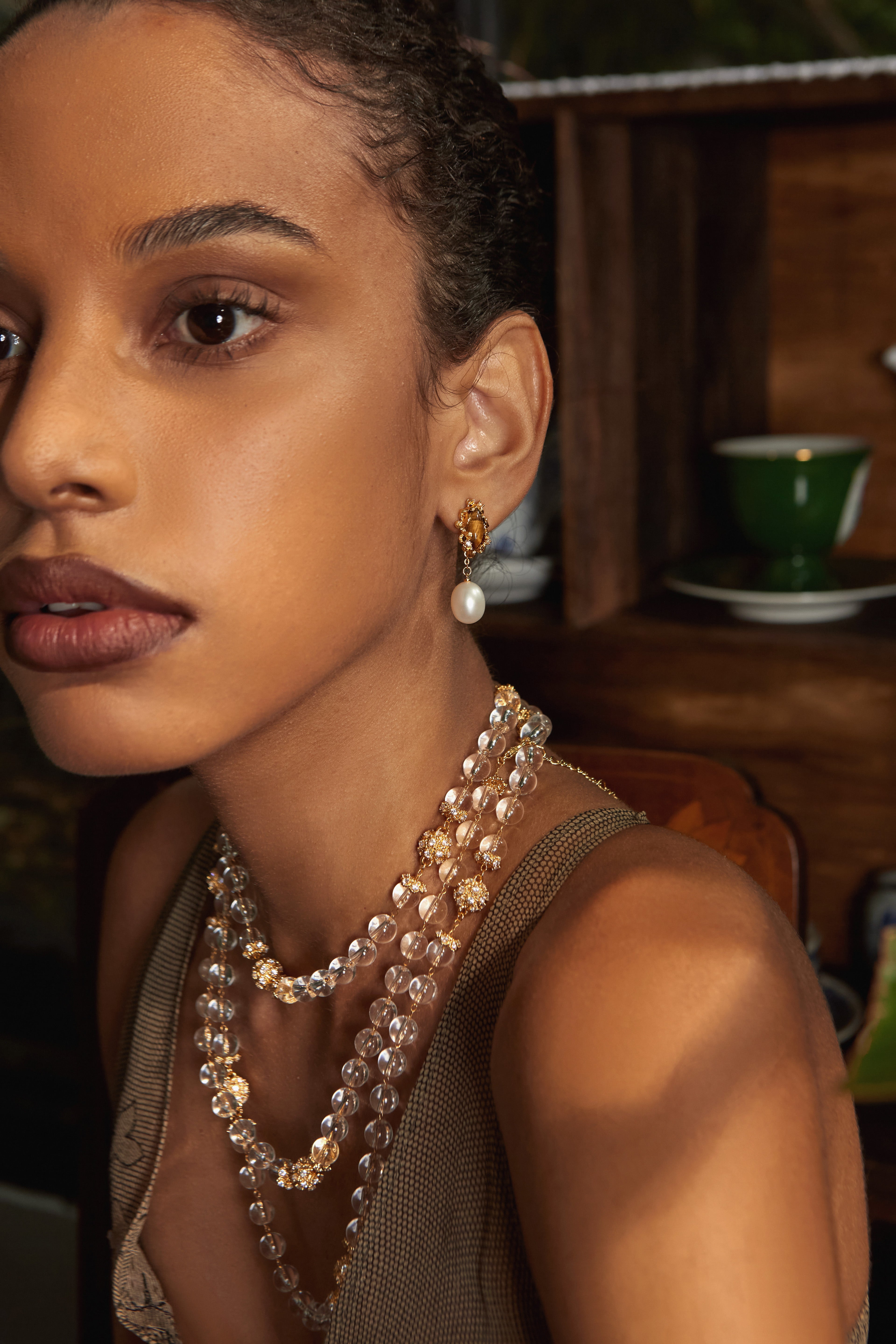 Delicately accented with freshwater pearls, these earrings interpret the urban feminine power that balances strength and grace.