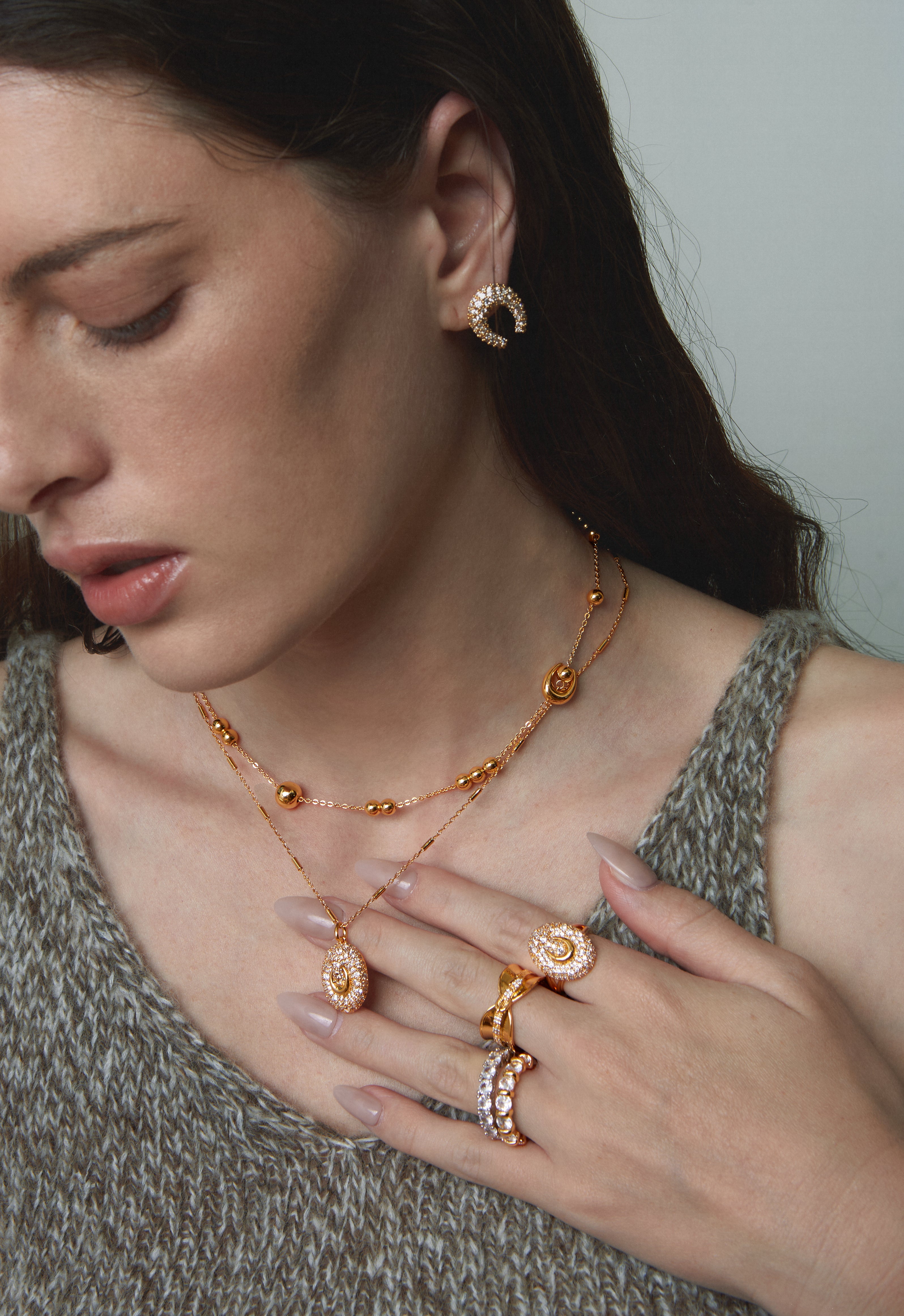 Hand-set cubic zirconia stones follow the natural contours of the design, softening the structured silhouette with flowing light. Even paired with simple outfits, the dimensional sparkle draws the eye and elevates the entire look.