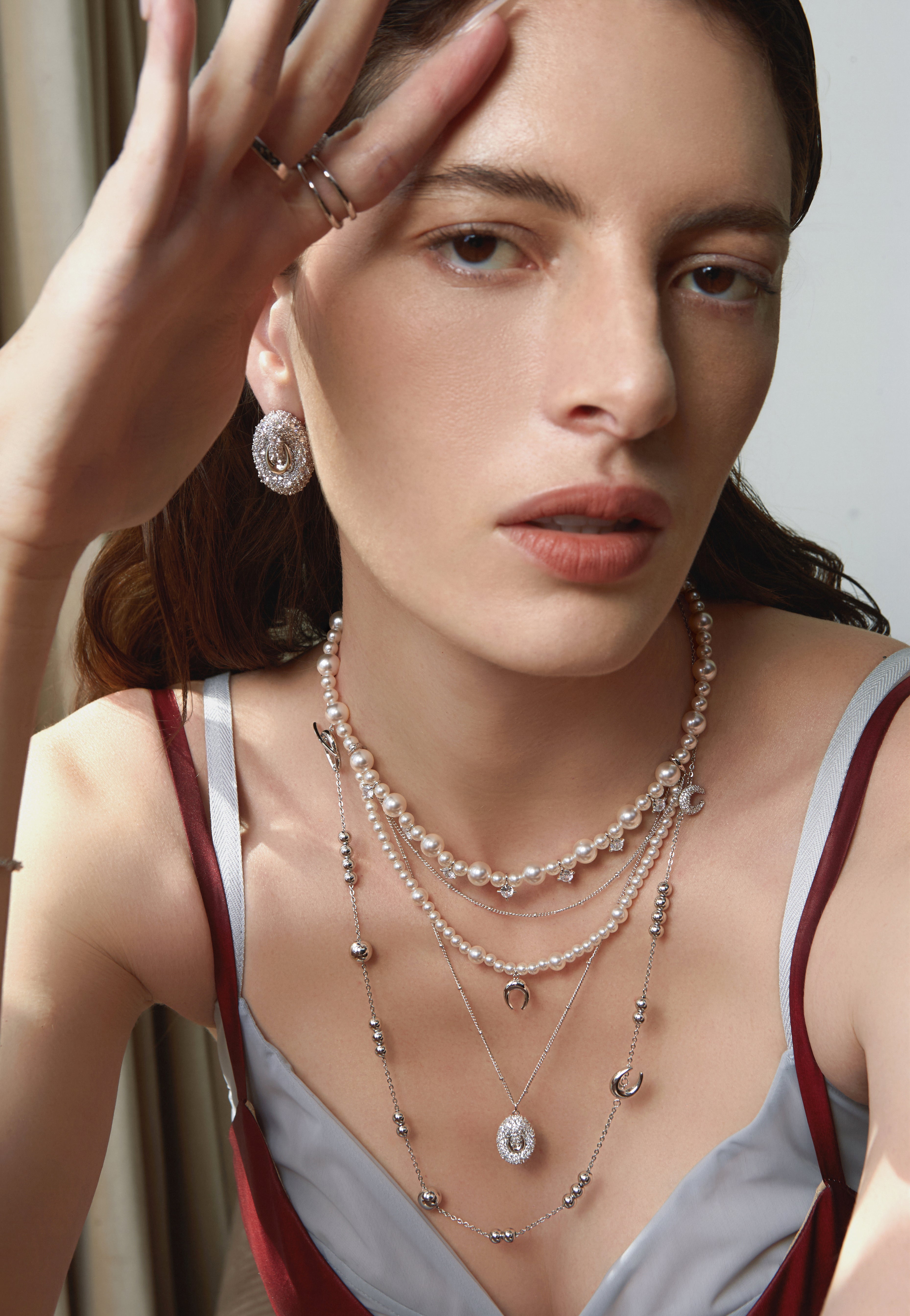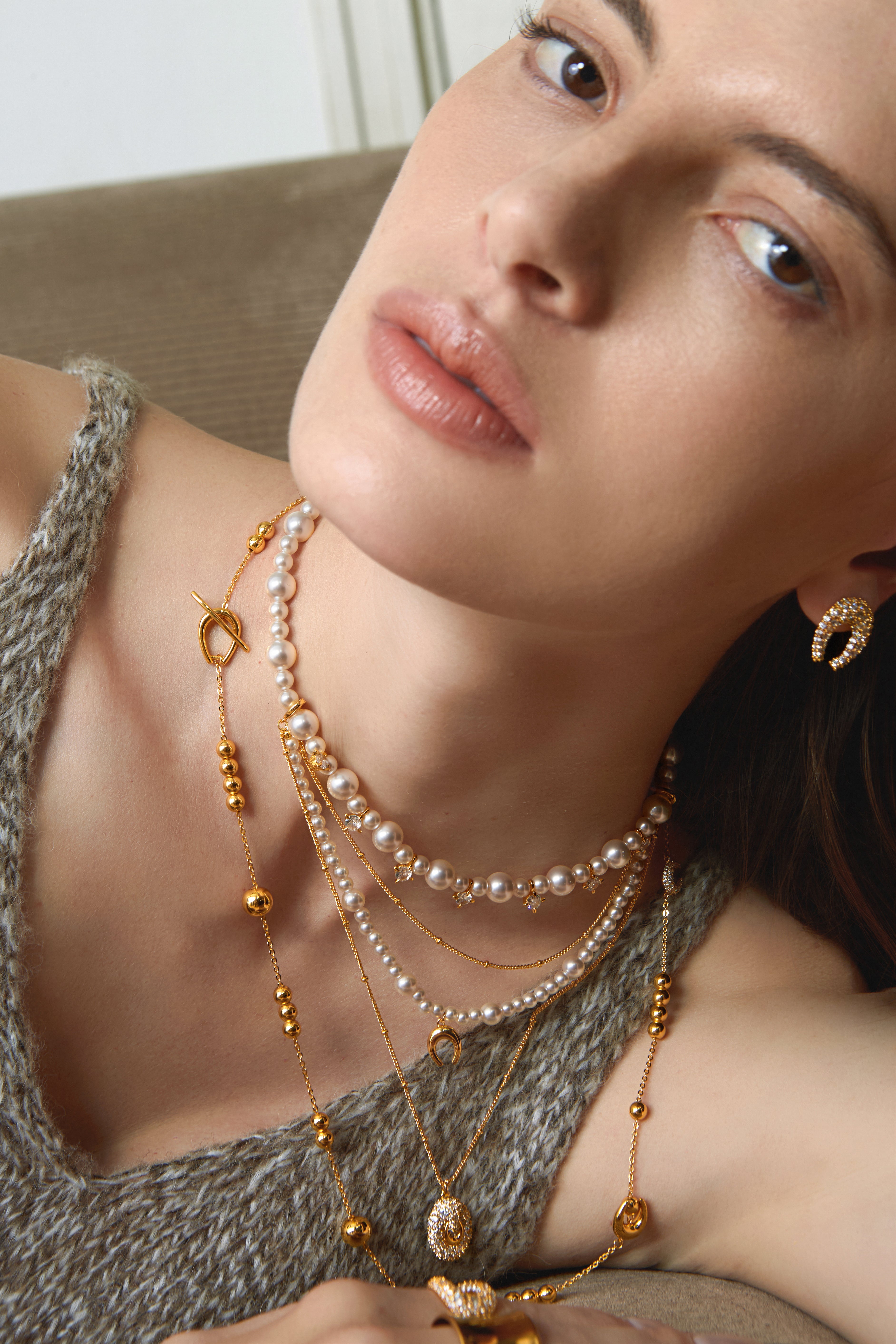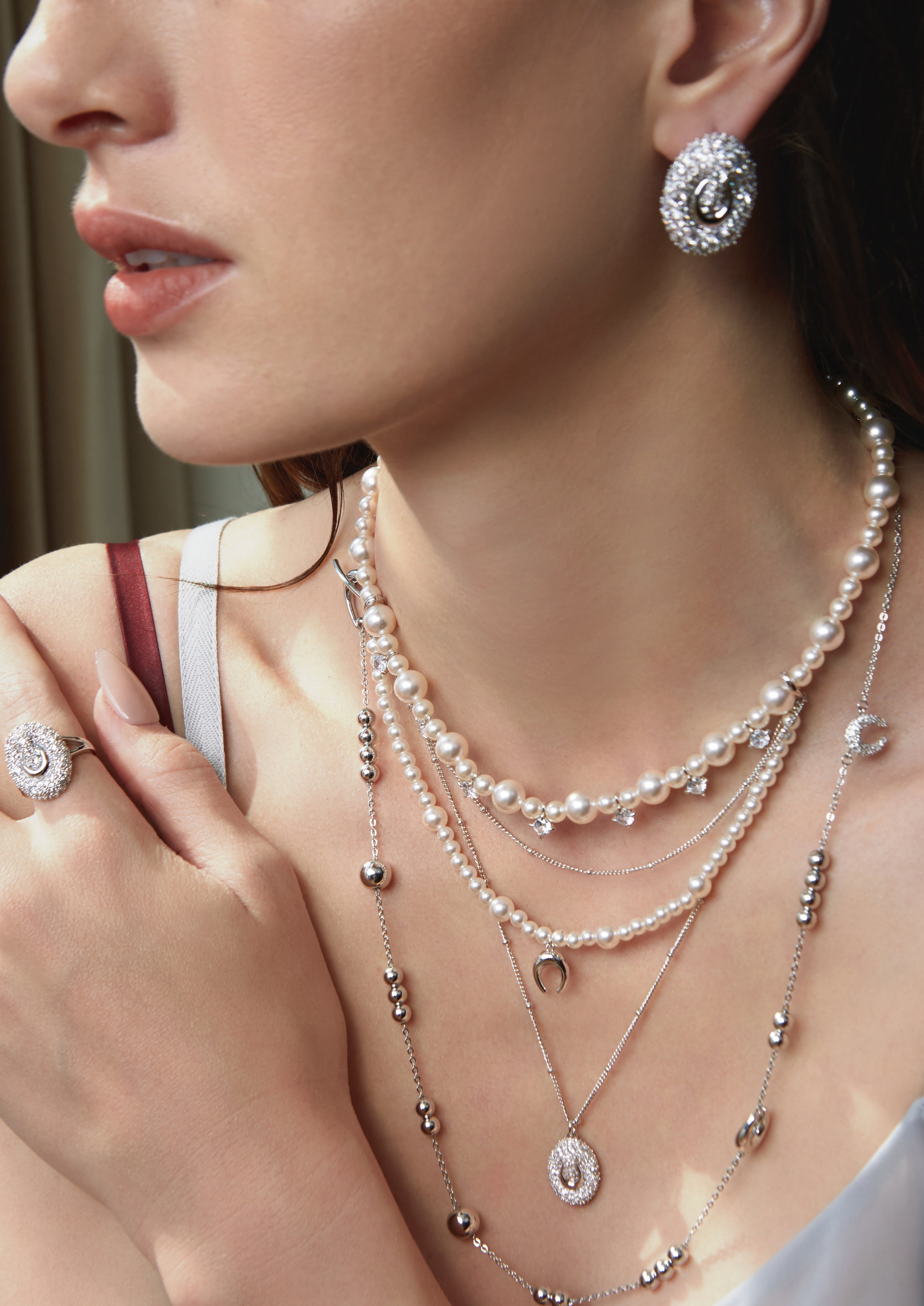 An elevated layered design combining pearls and fine chains.