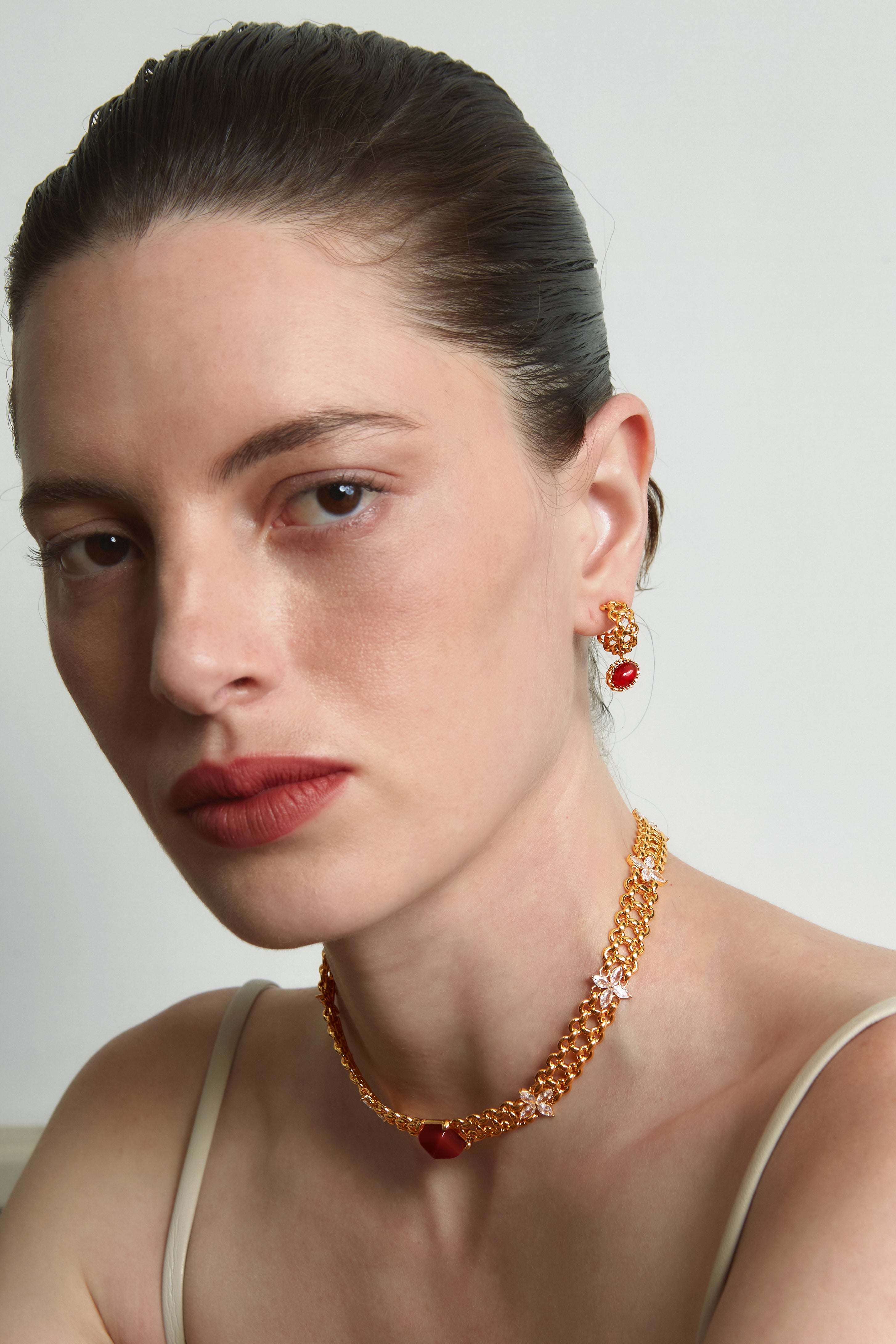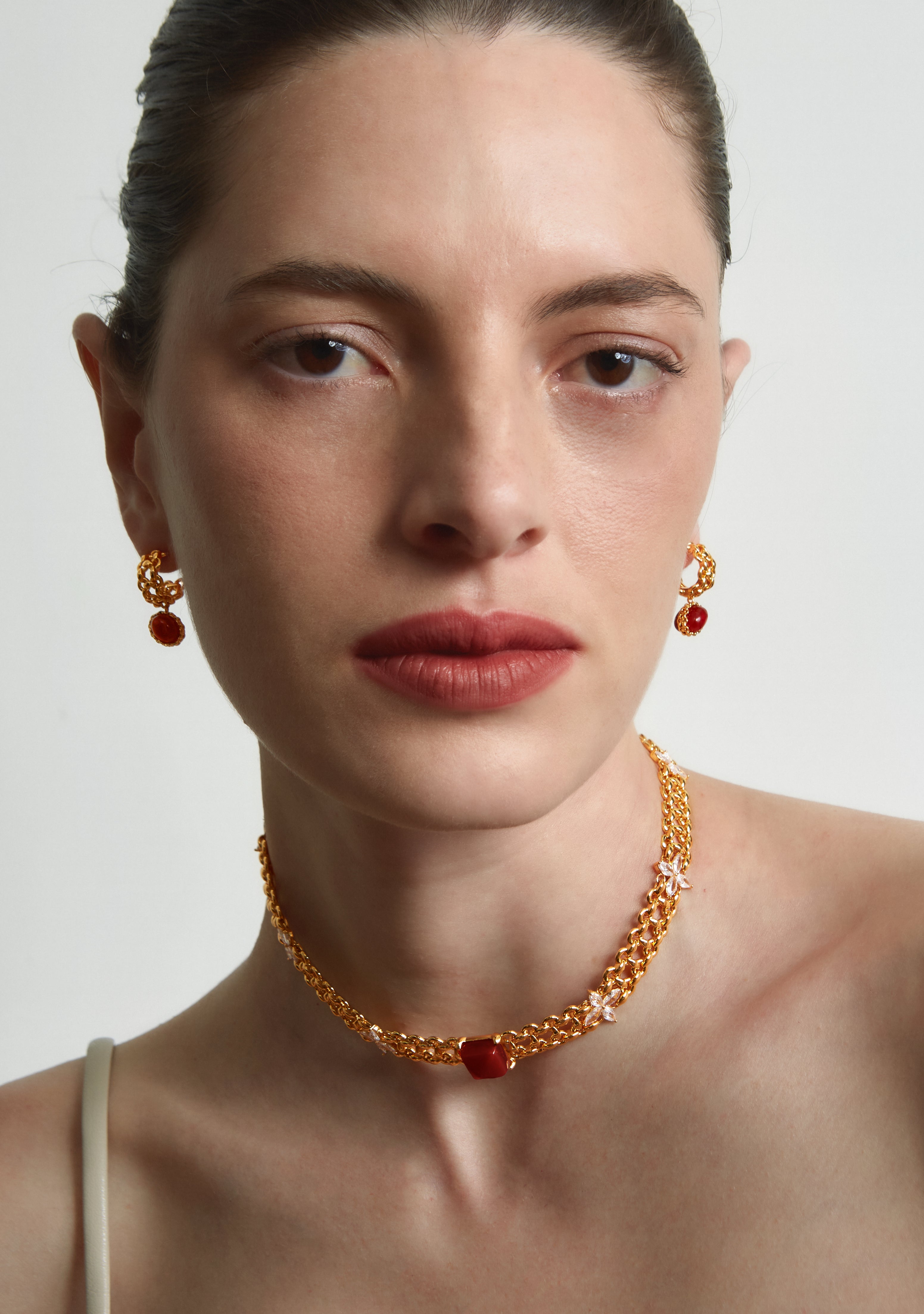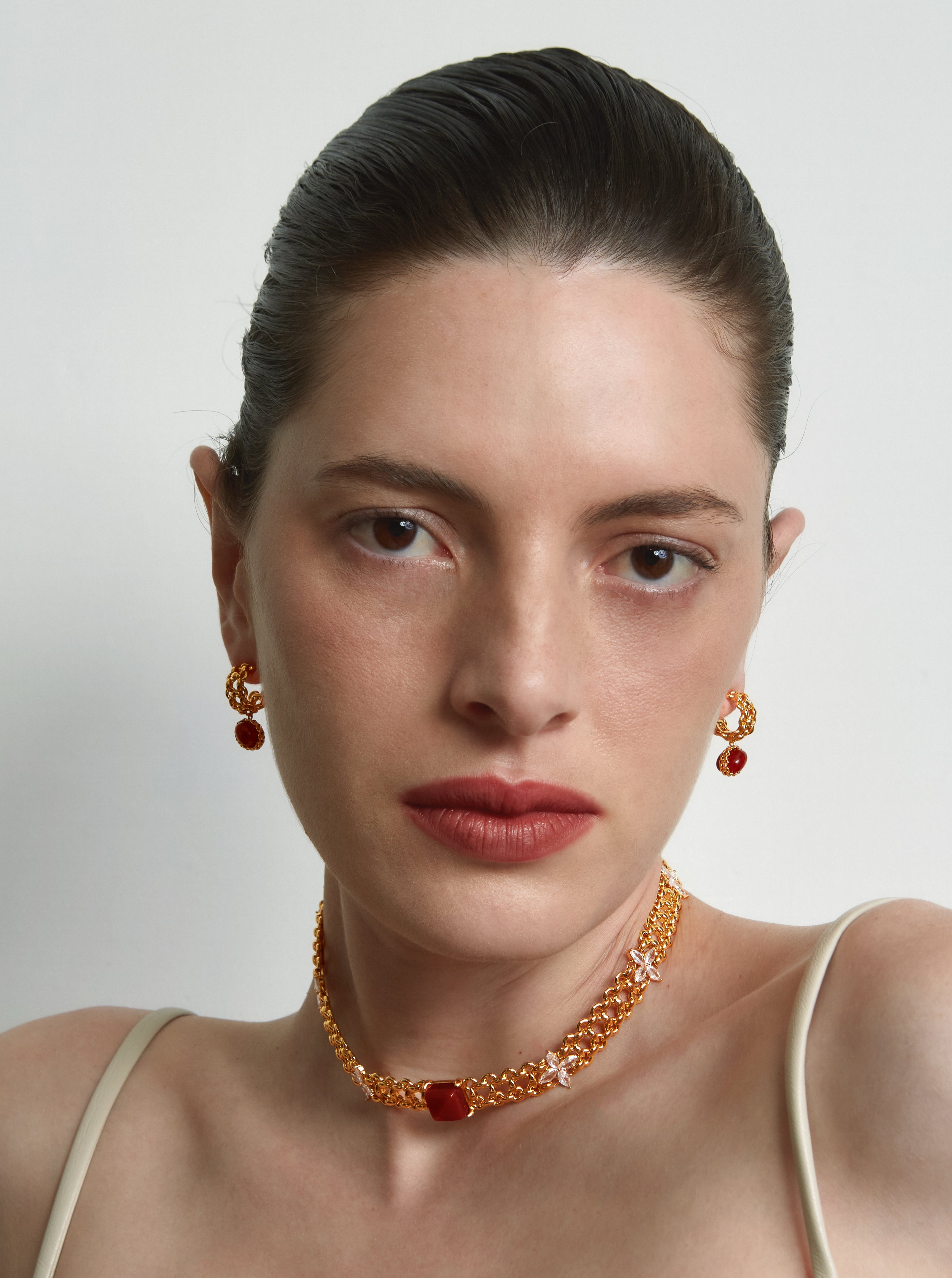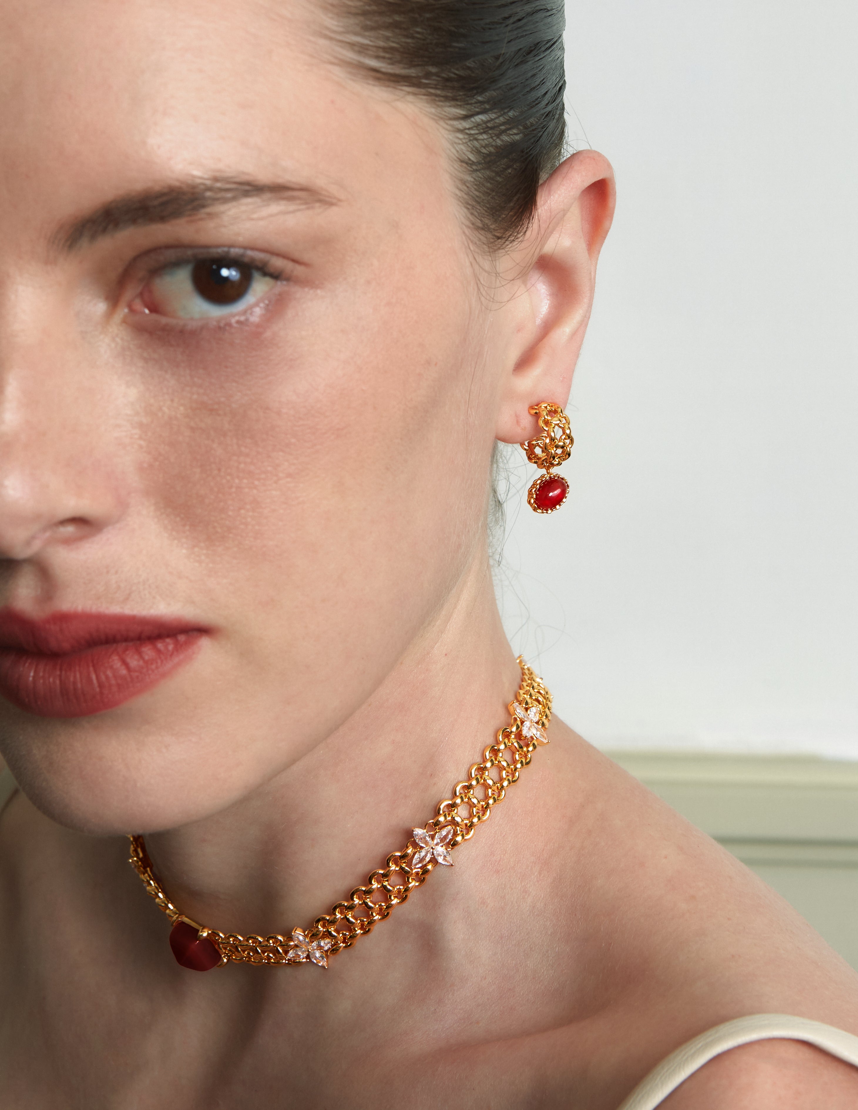 Two cabochon red agates are set back-to-back, forming a fuller, more three-dimensional silhouette that elevates the design with true jewelry-grade presence.