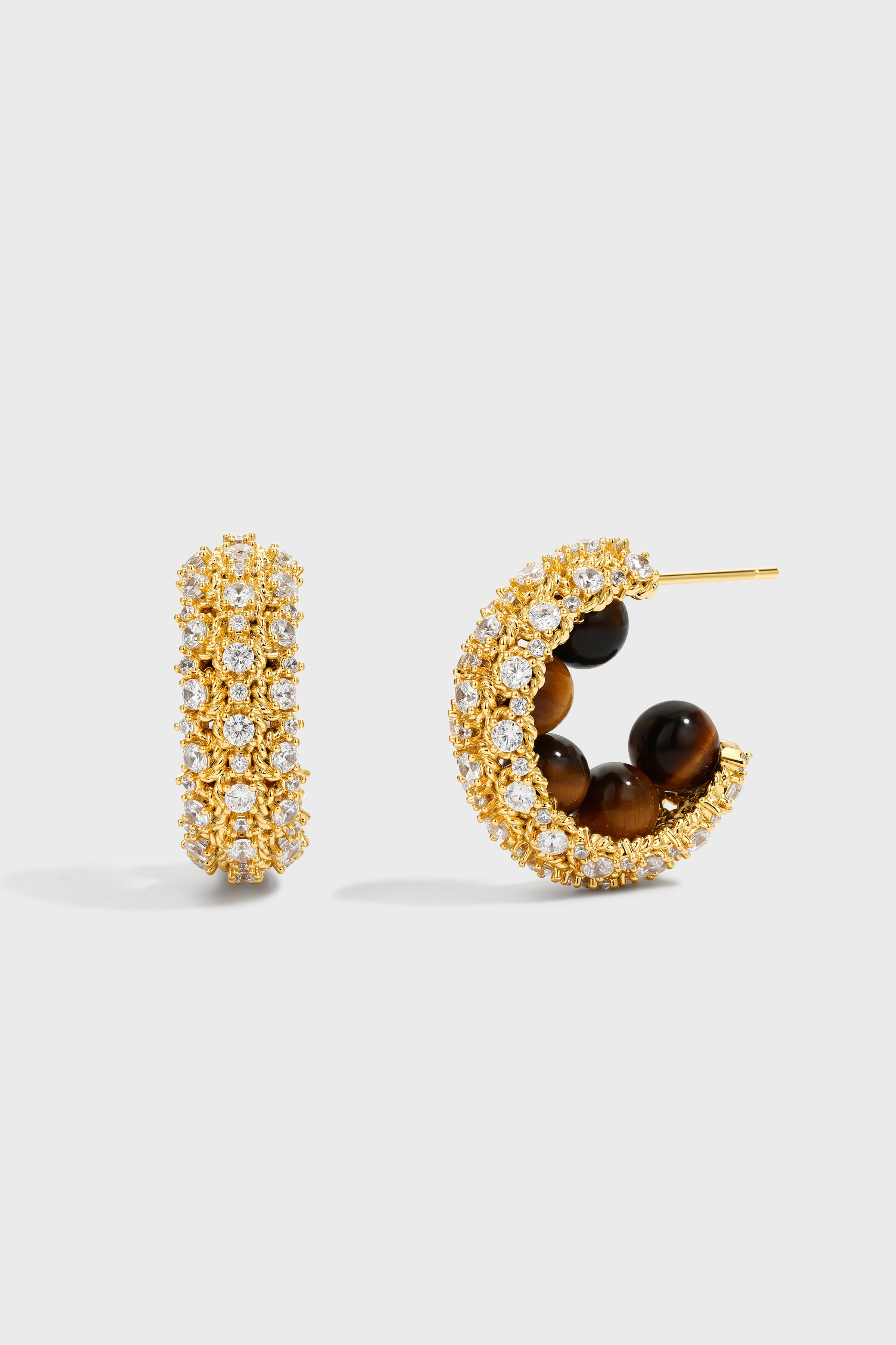 Material: 24K Gold-plated Copper, Tiger Eye, Cubic Zirconia, 925 Silver Post