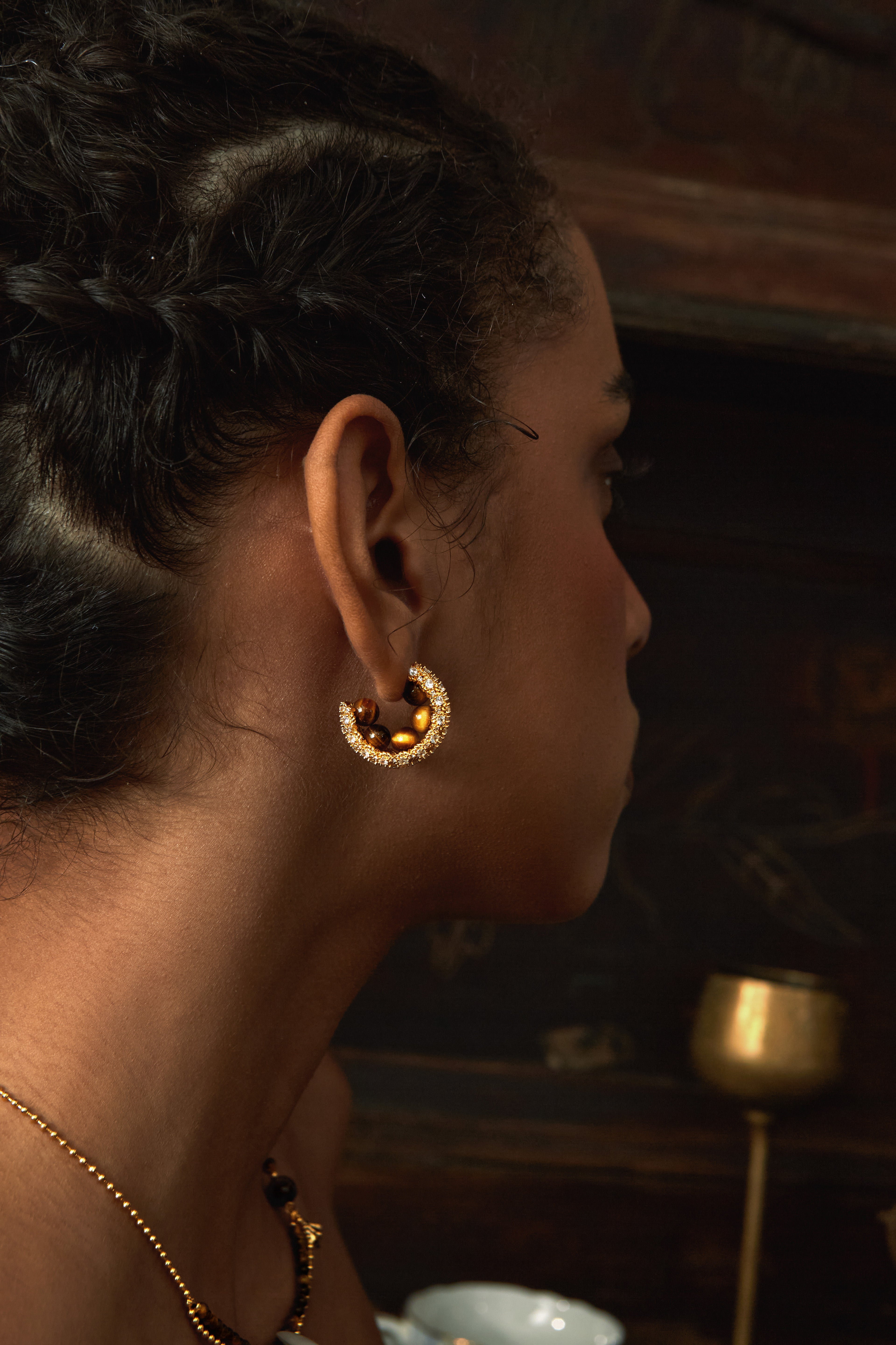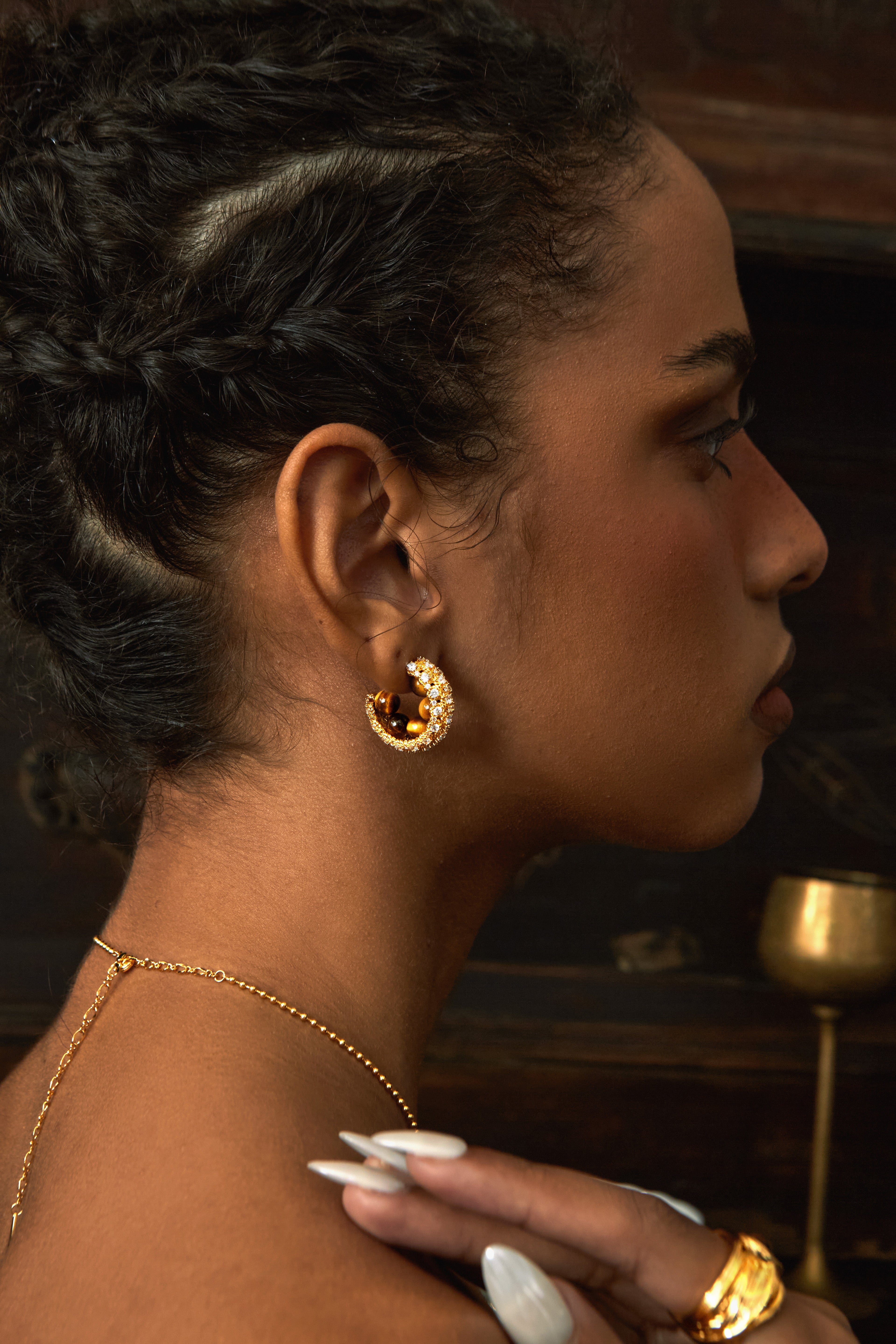Rooted in the Maillard-inspired color palette, this design fuses the brown-golden gradient of Tiger Eye with a liquid gold sheen, accented with Cubic Zirconia — creating a warm, grounded yet dynamic vintage jewelry piece for fall and winter.