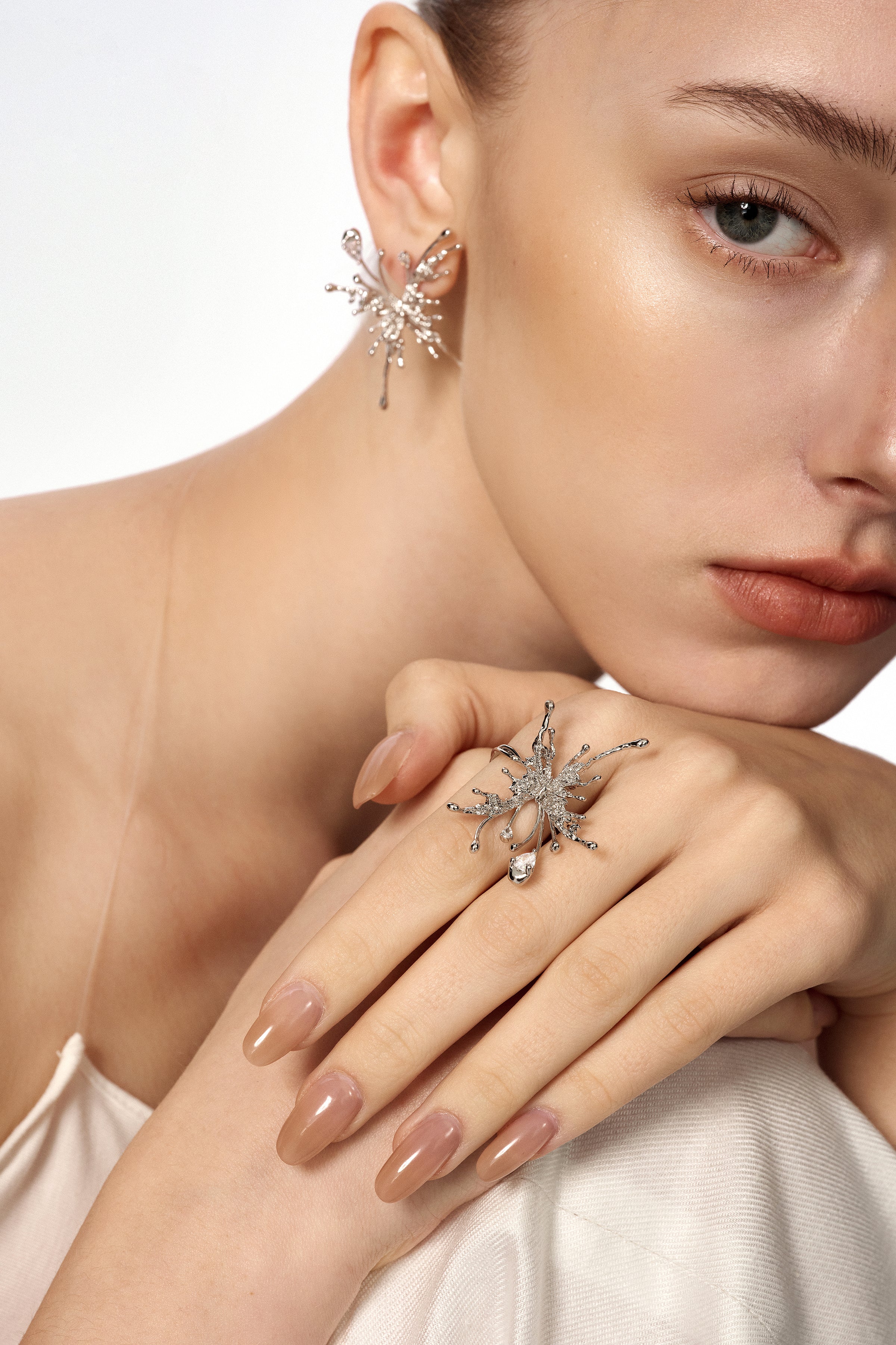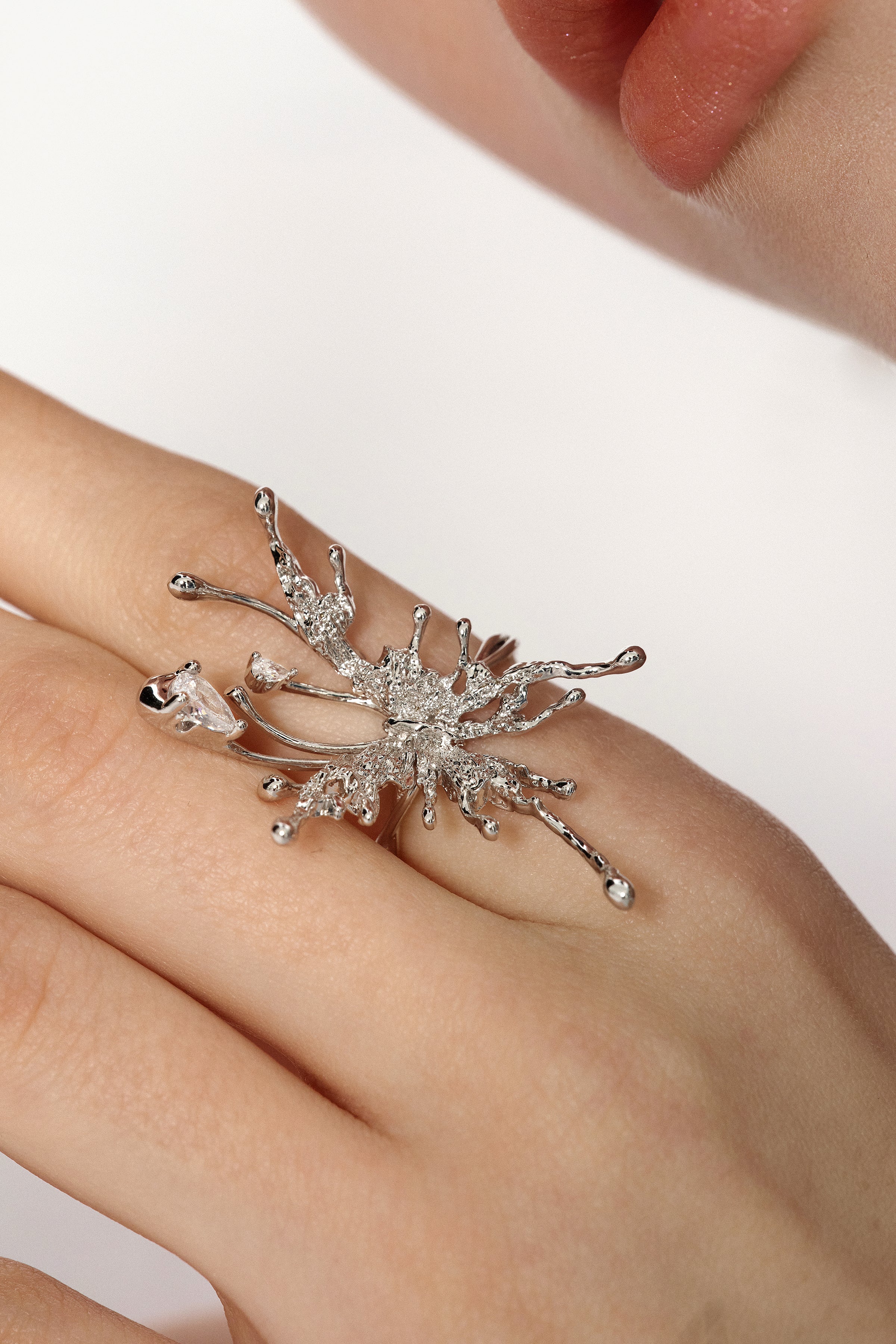 This statement ring features a bold, sculptural butterfly form that blooms across the finger,
