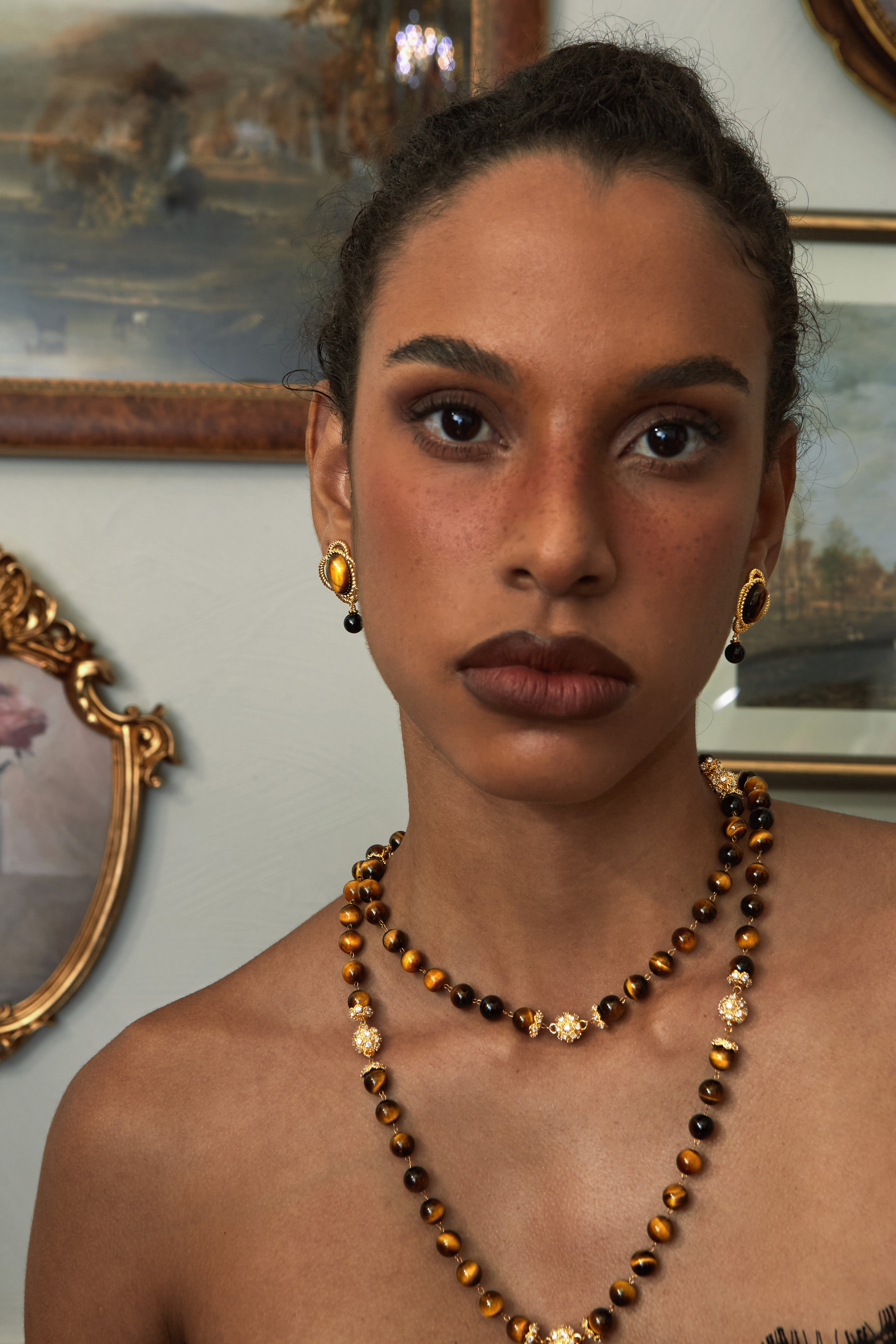 Rooted in the Maillard-inspired color palette, this design fuses the brown-golden gradient of Tiger Eye with Black Onyx and a liquid gold sheen — creating a warm, grounded yet dynamic vintage jewelry piece for fall and winter.