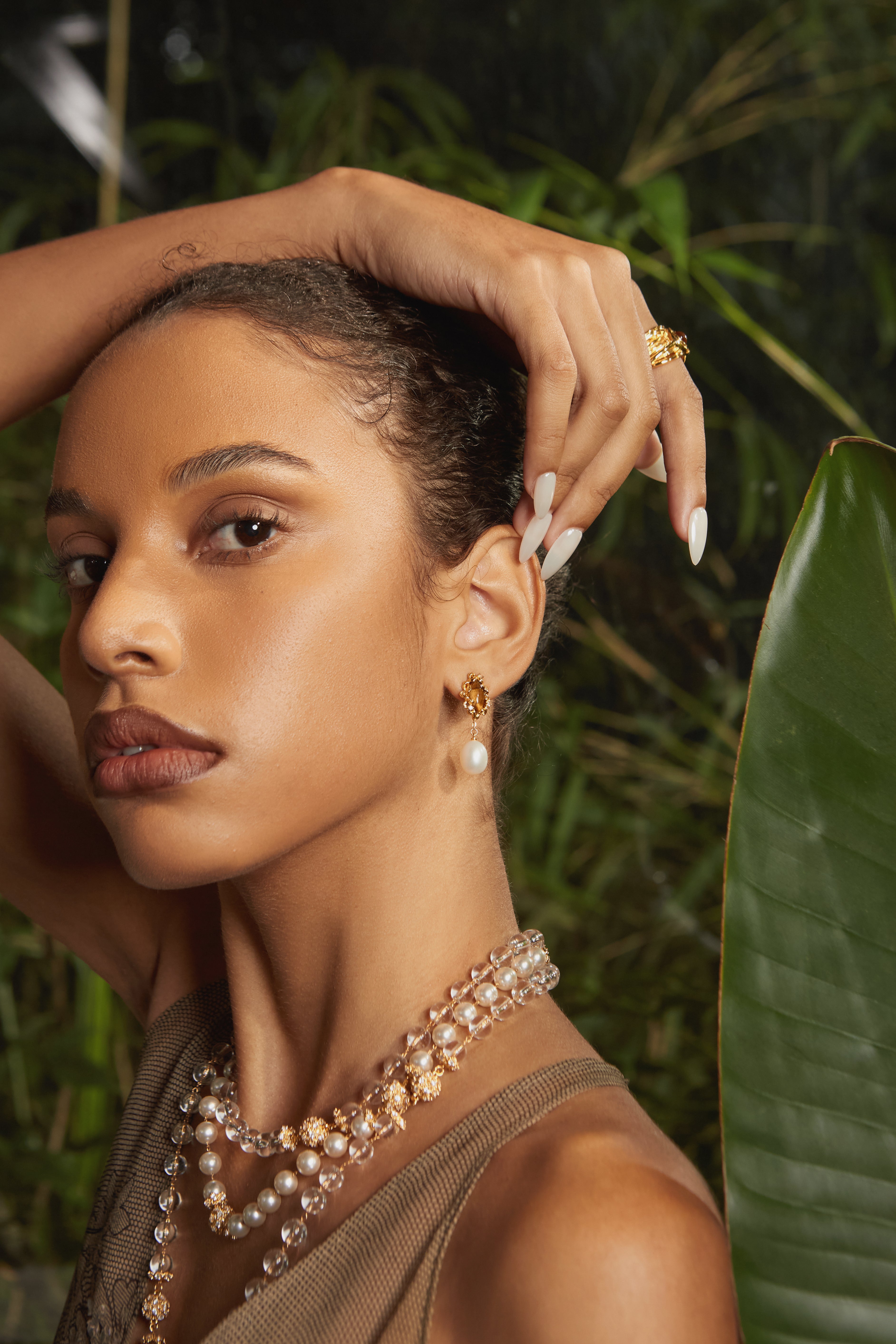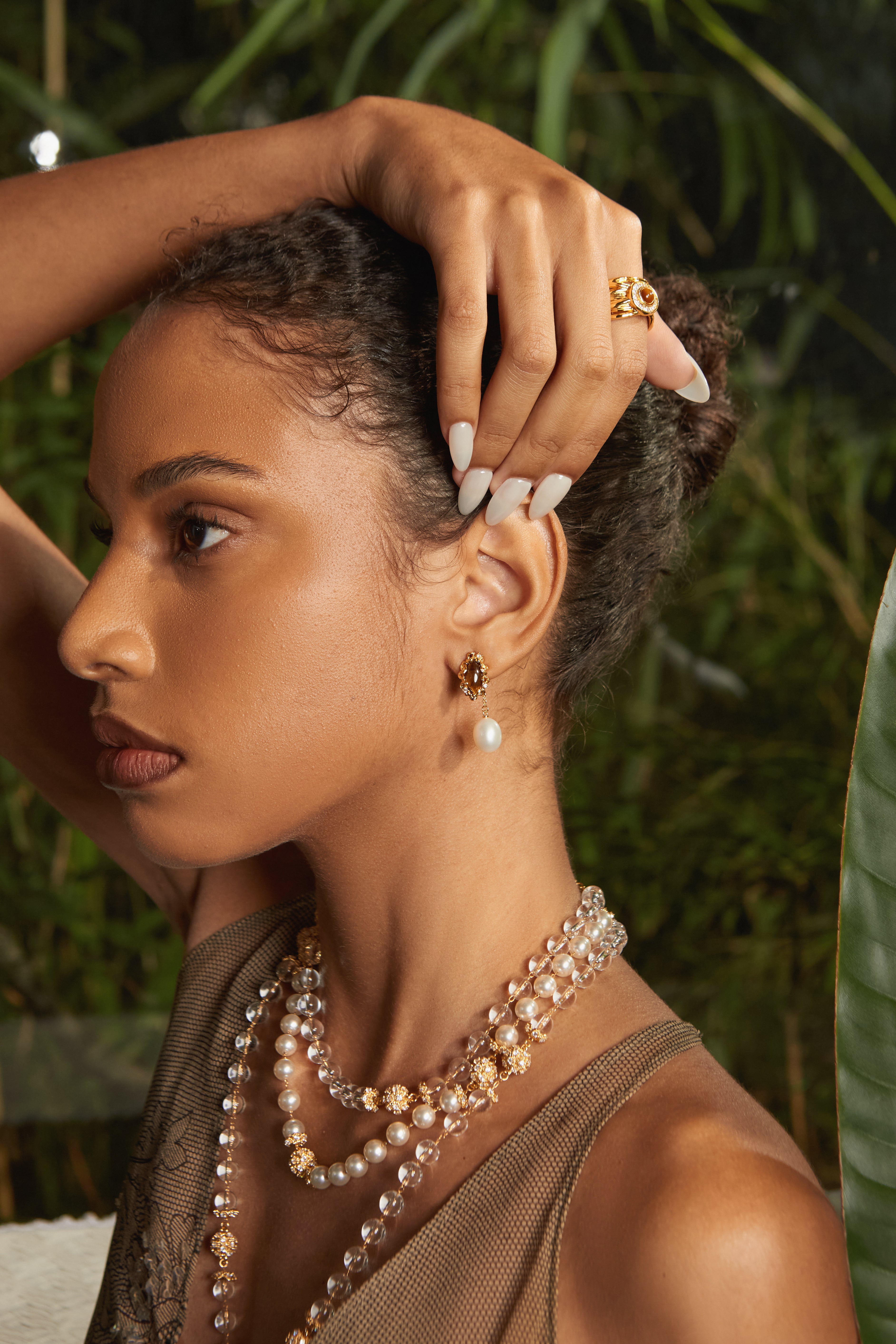 Delicately accented with freshwater pearls, these earrings interpret the urban feminine power that balances strength and grace.