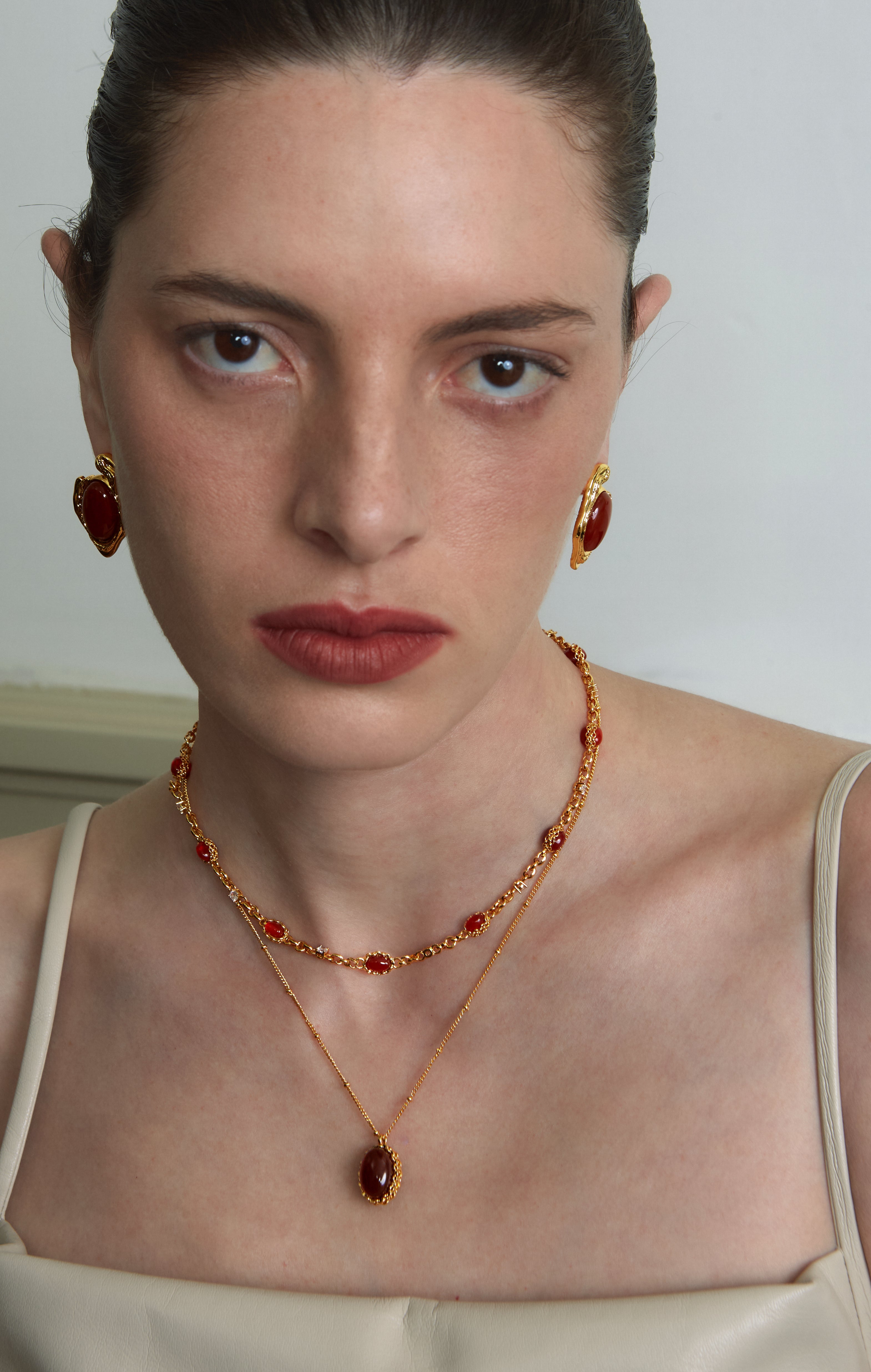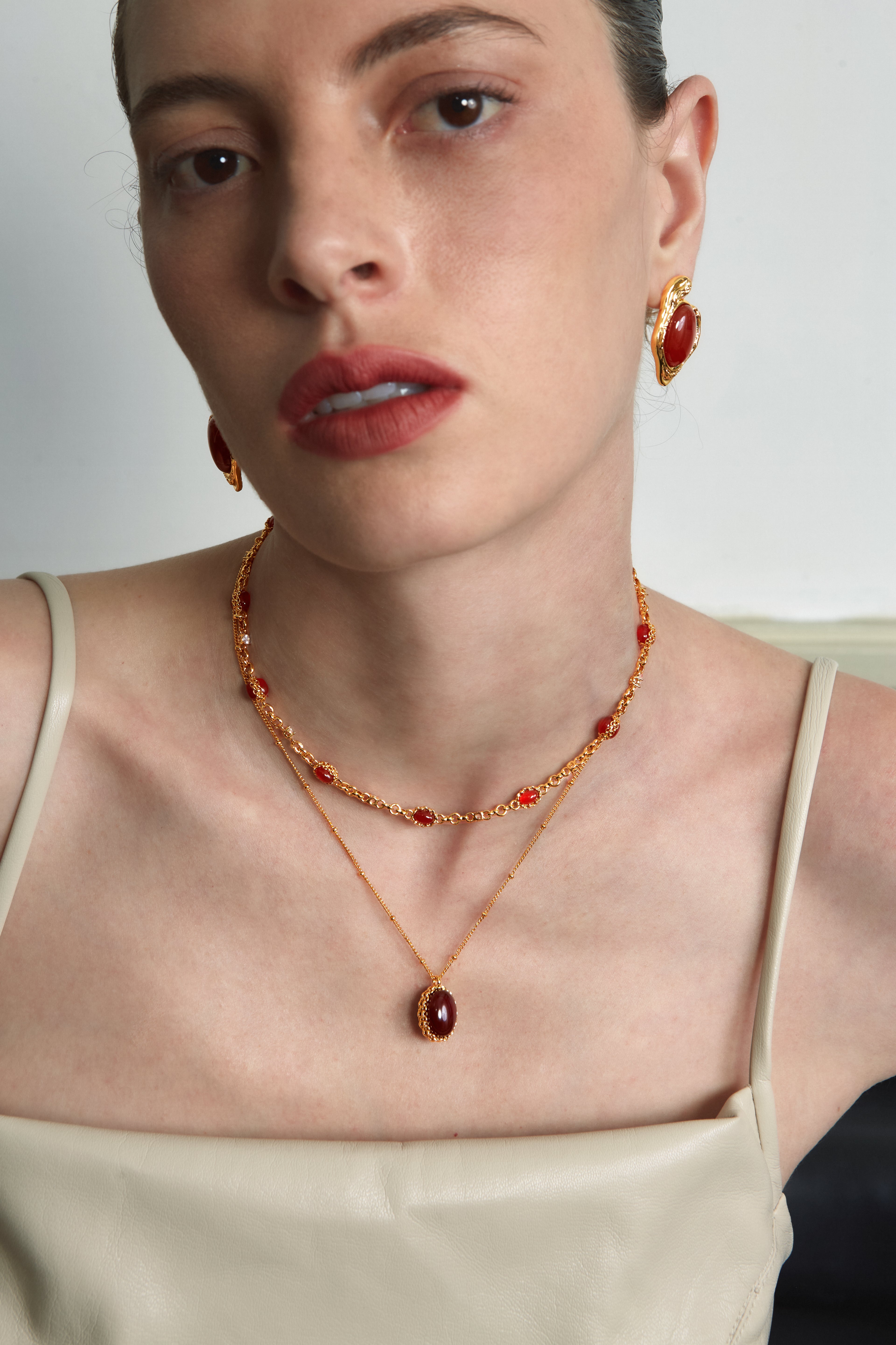 The oval red agate features a unique double-sided construction, with two cabochon agates seamlessly set back-to-back to form one full, dimensional centerpiece, creating a richer and more sculptural visual effect.
