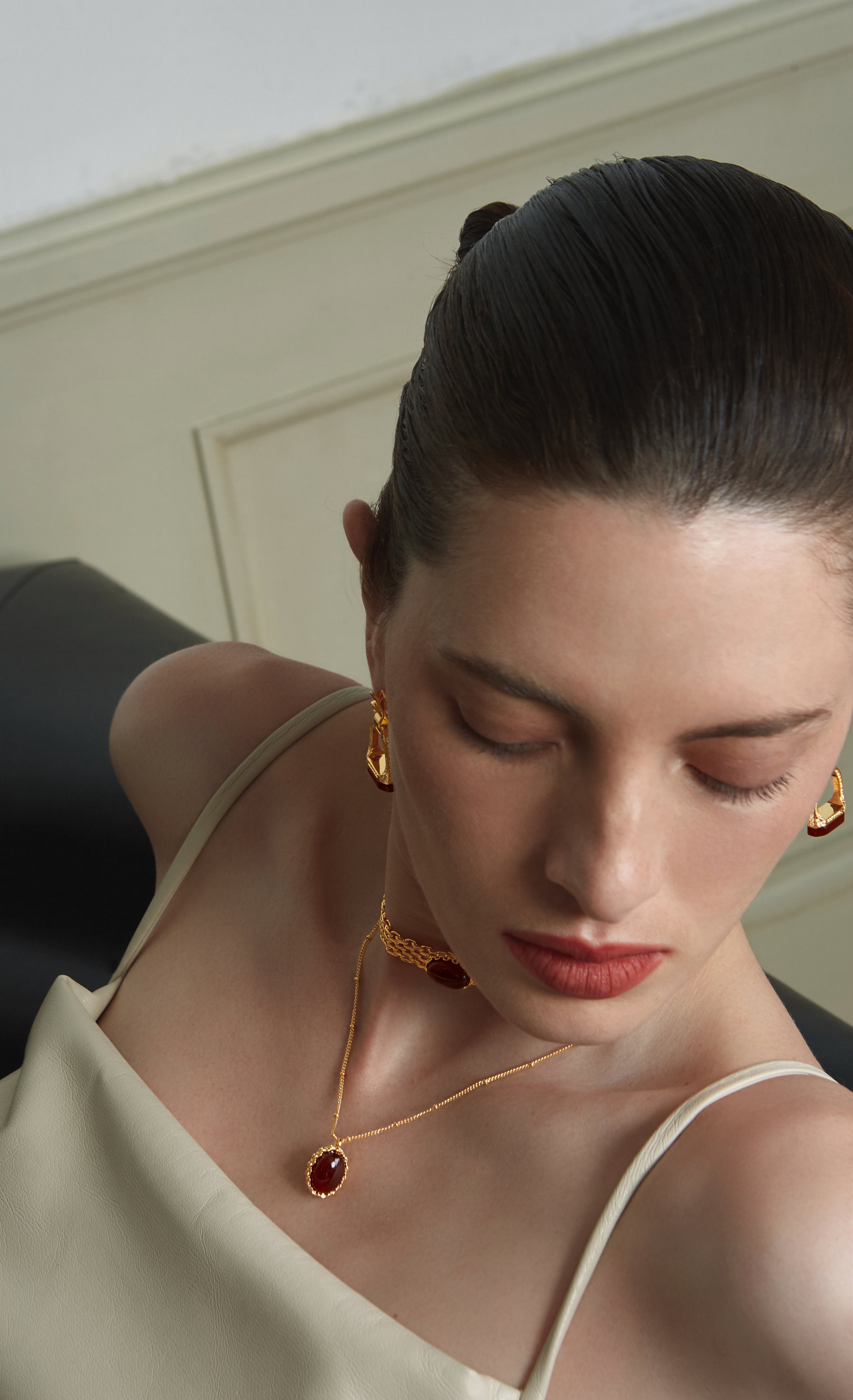 Crafted with selected natural, jewelry-grade red agate, showcasing a deep, saturated hue reminiscent of a lustrous ruby. Each piece is naturally unique and offers refined, fine-jewelry quality.