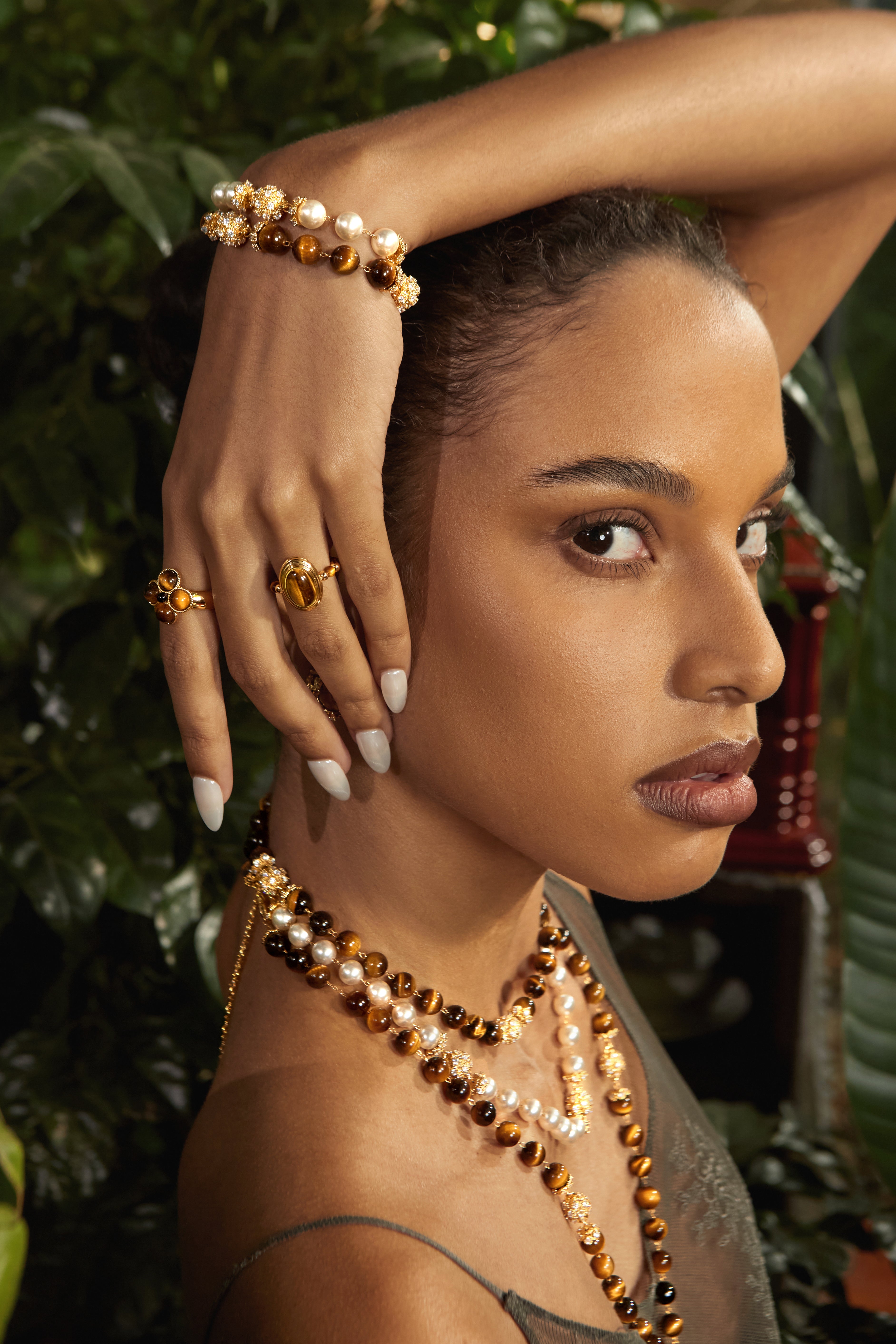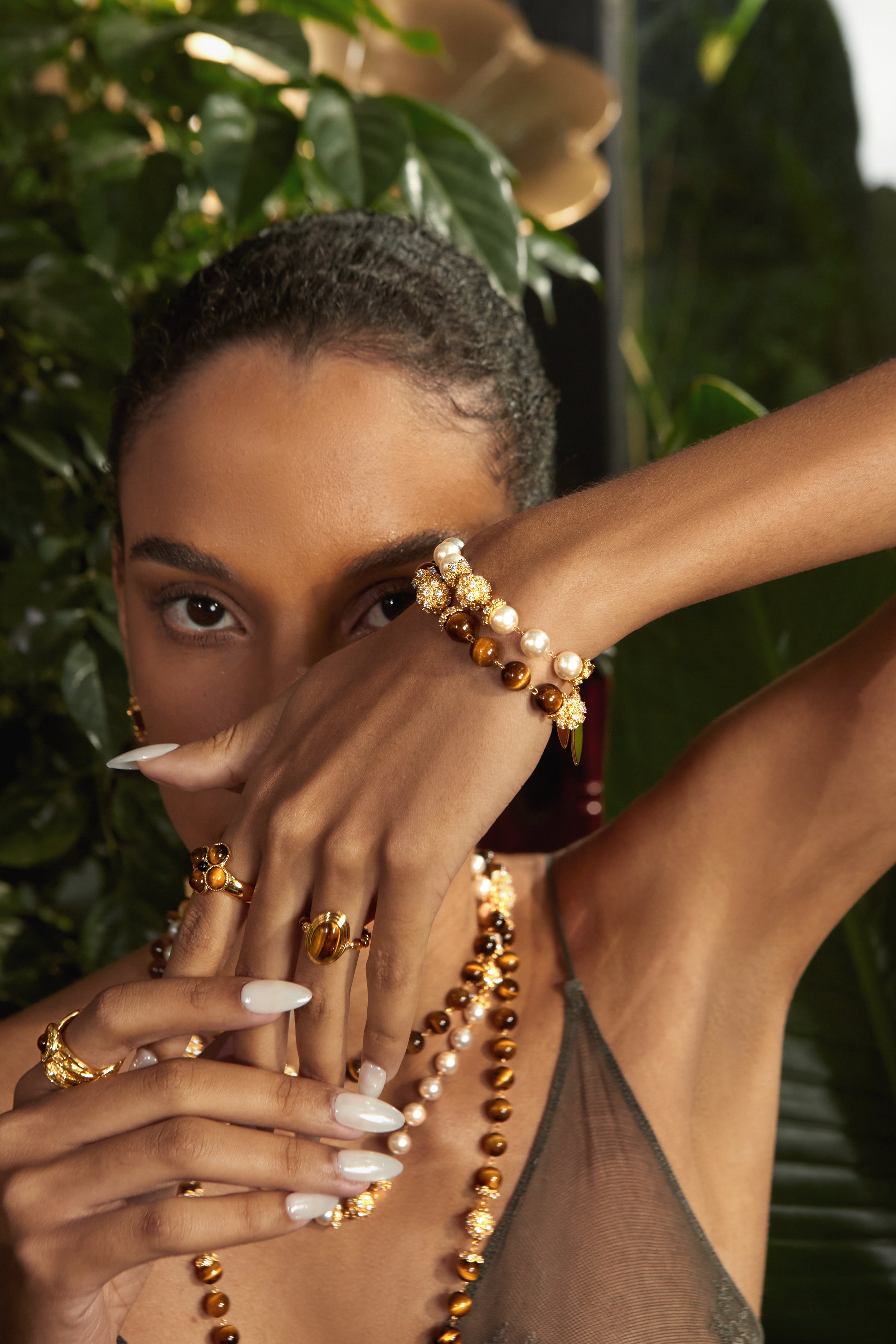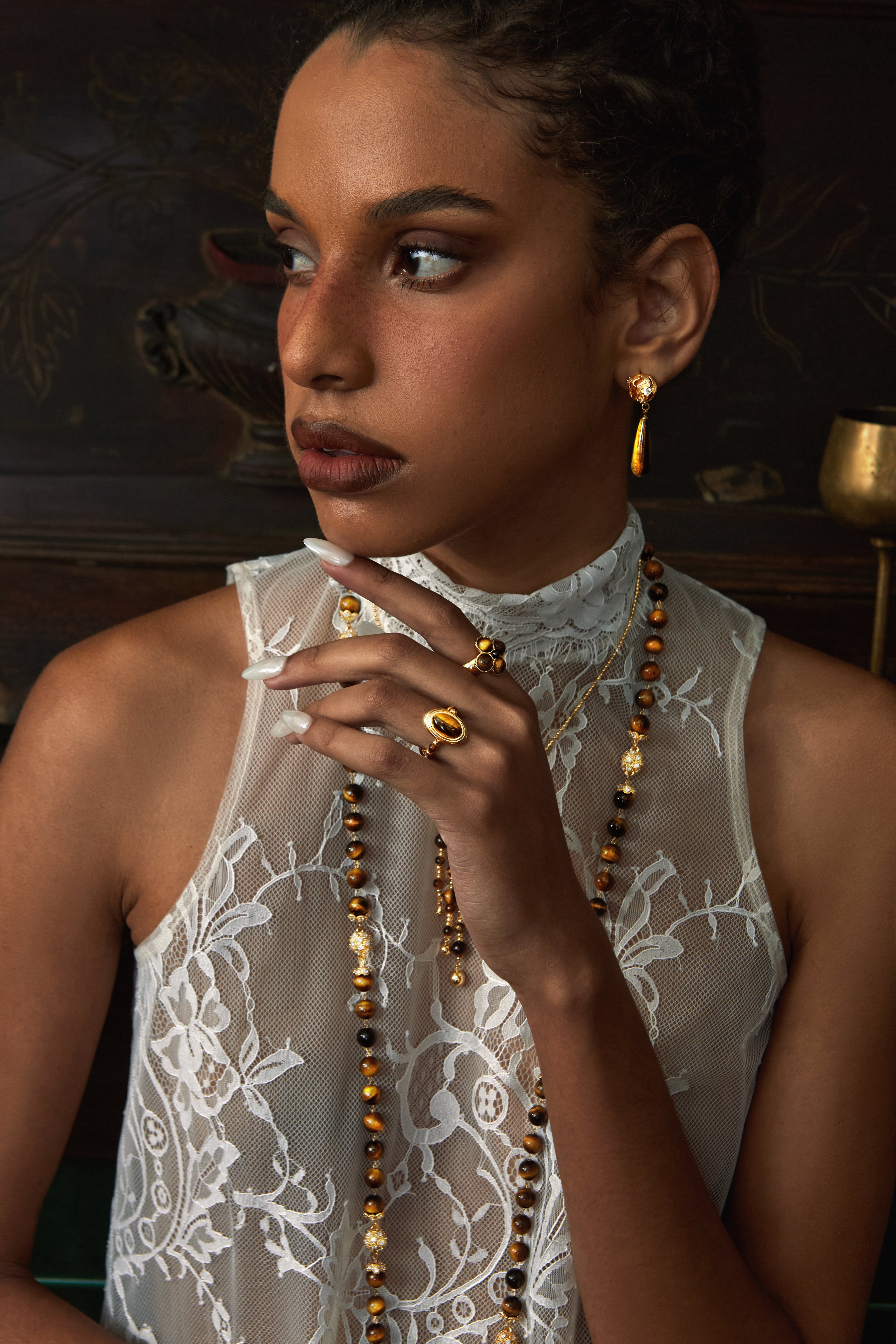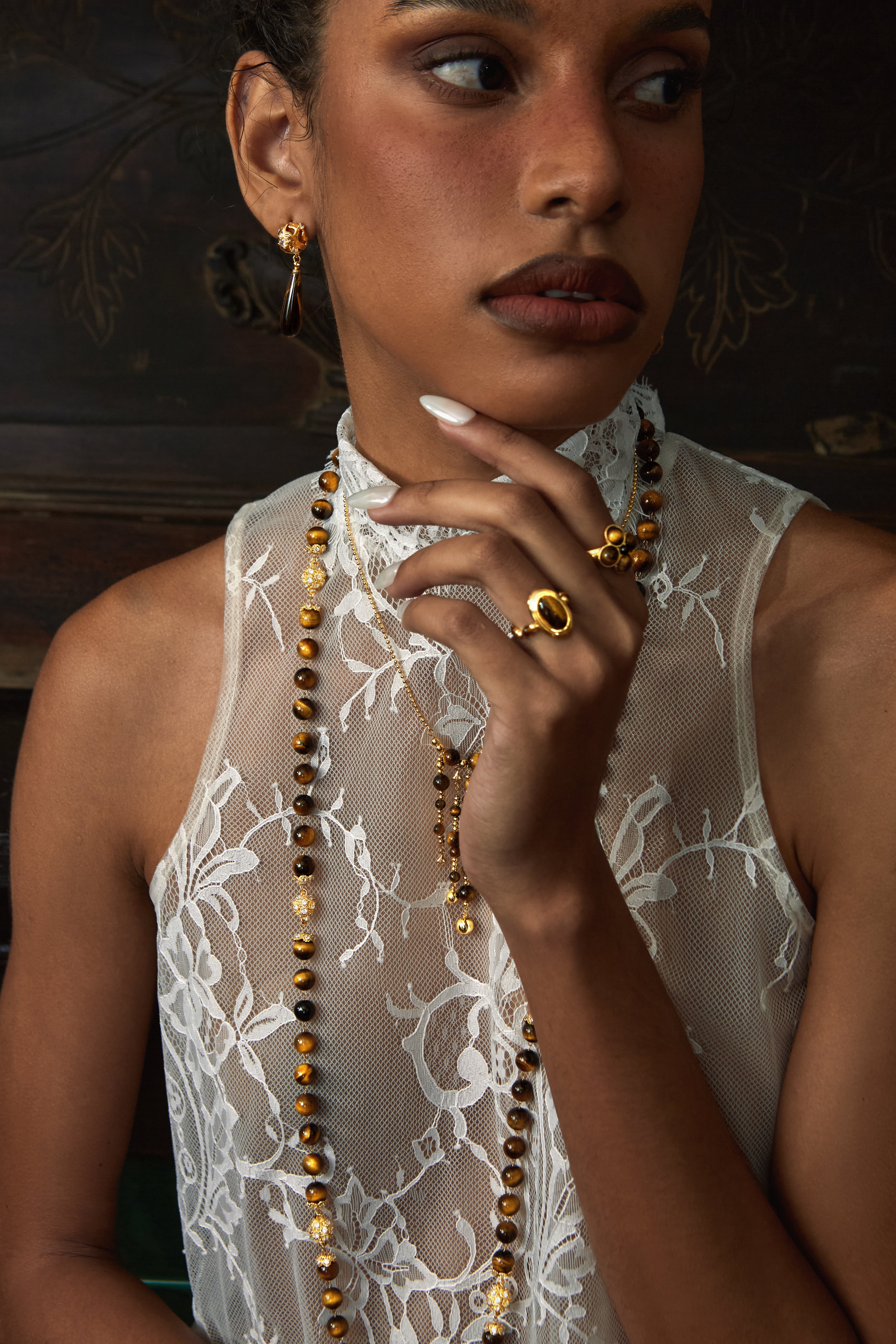 Rooted in the Maillard-inspired color palette, this design fuses the brown-golden gradient of Tiger Eye with a liquid gold sheen — creating a warm, grounded yet dynamic vintage jewelry piece for fall and winter.