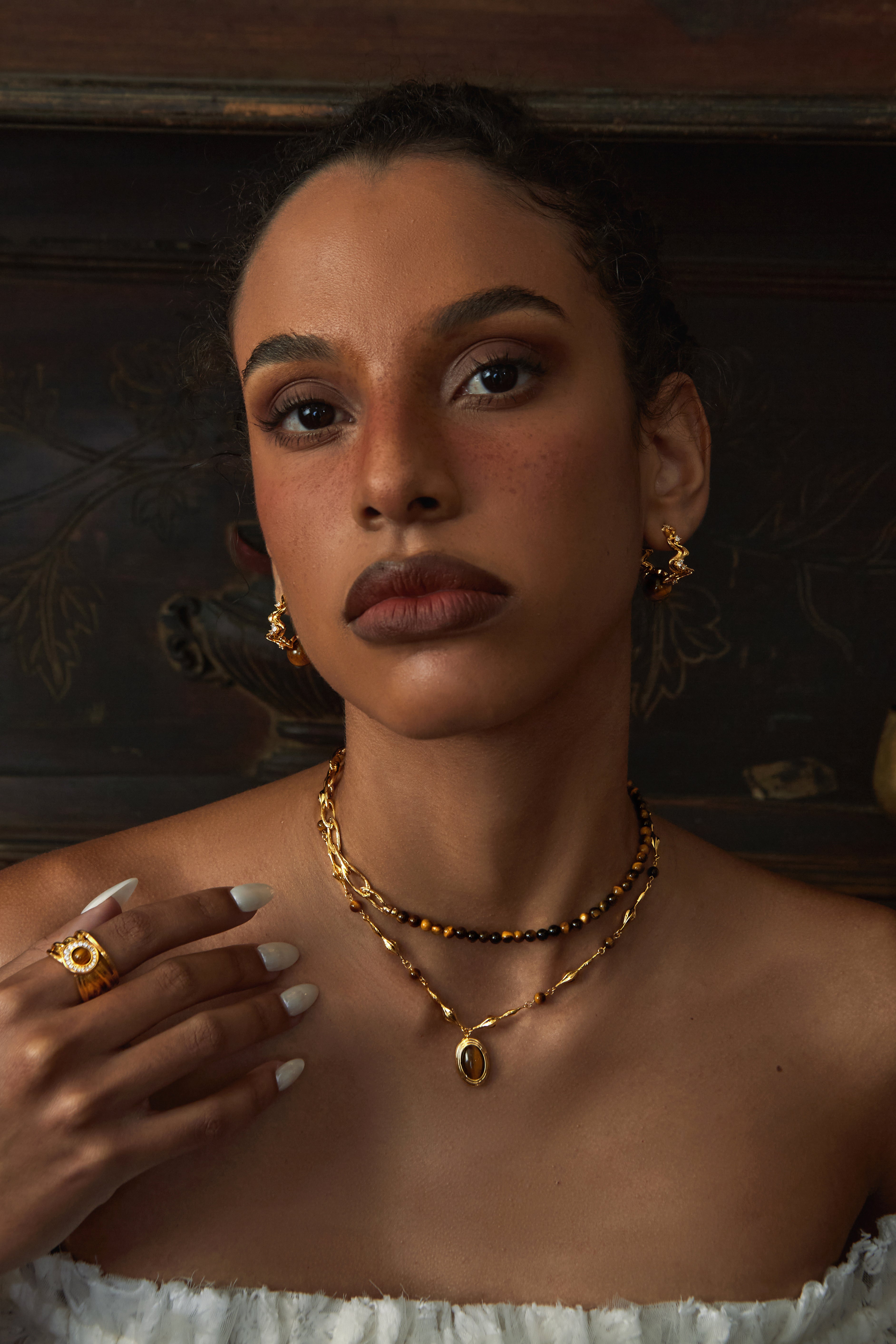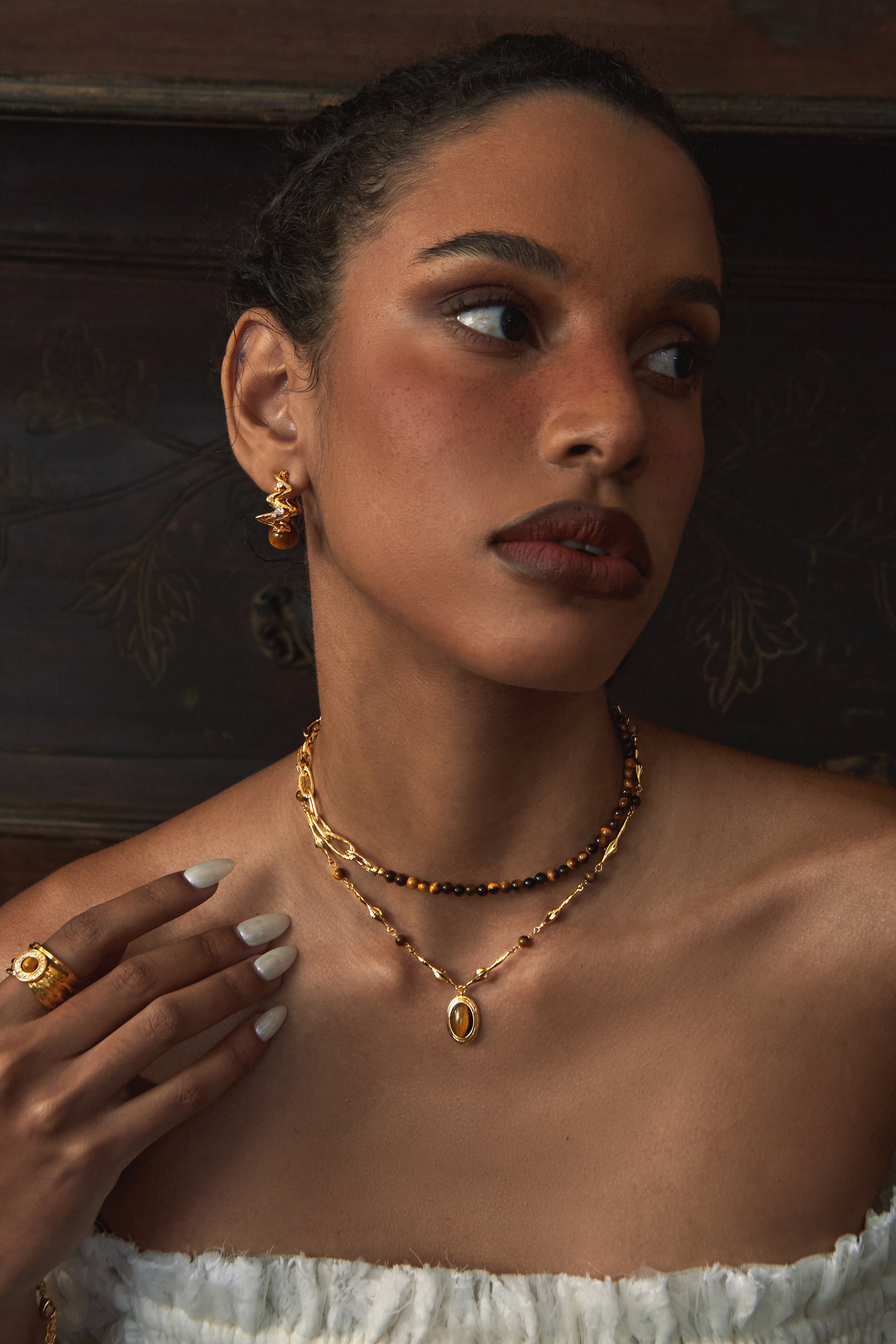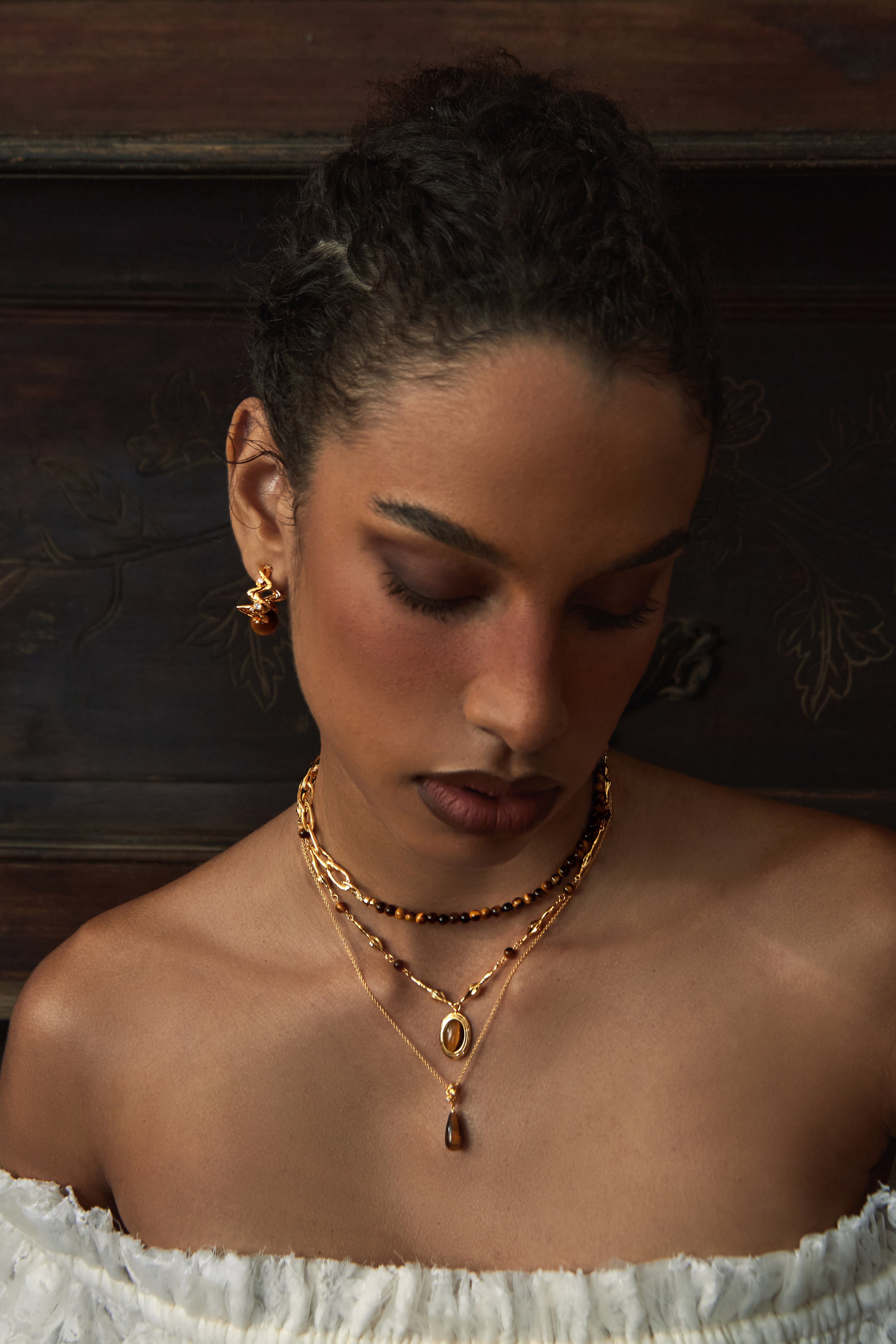 Rooted in the Maillard-inspired color palette, this design fuses the brown-golden gradient of Tiger Eye with a liquid gold sheen — creating a warm, grounded yet dynamic vintage jewelry piece for fall and winter.