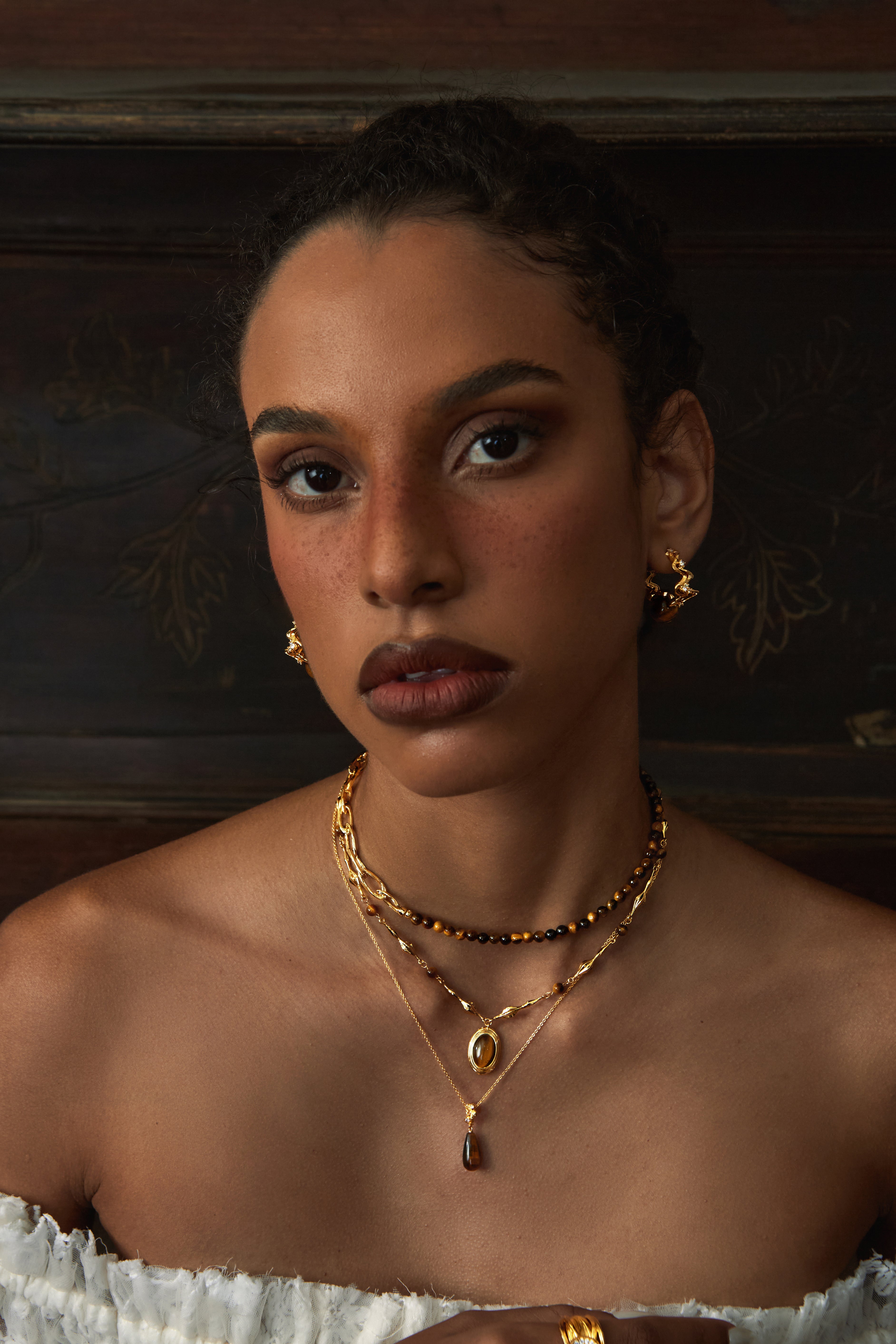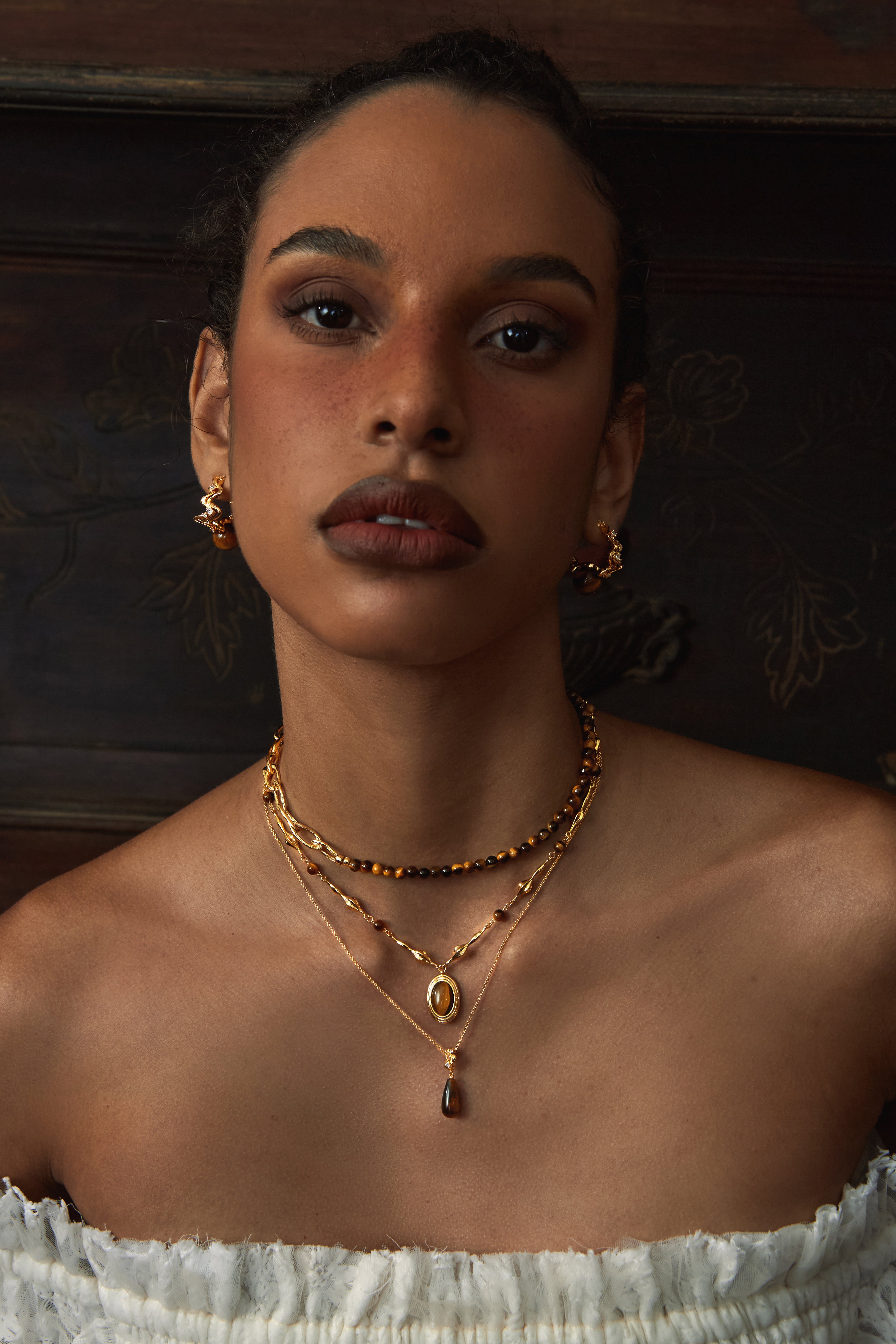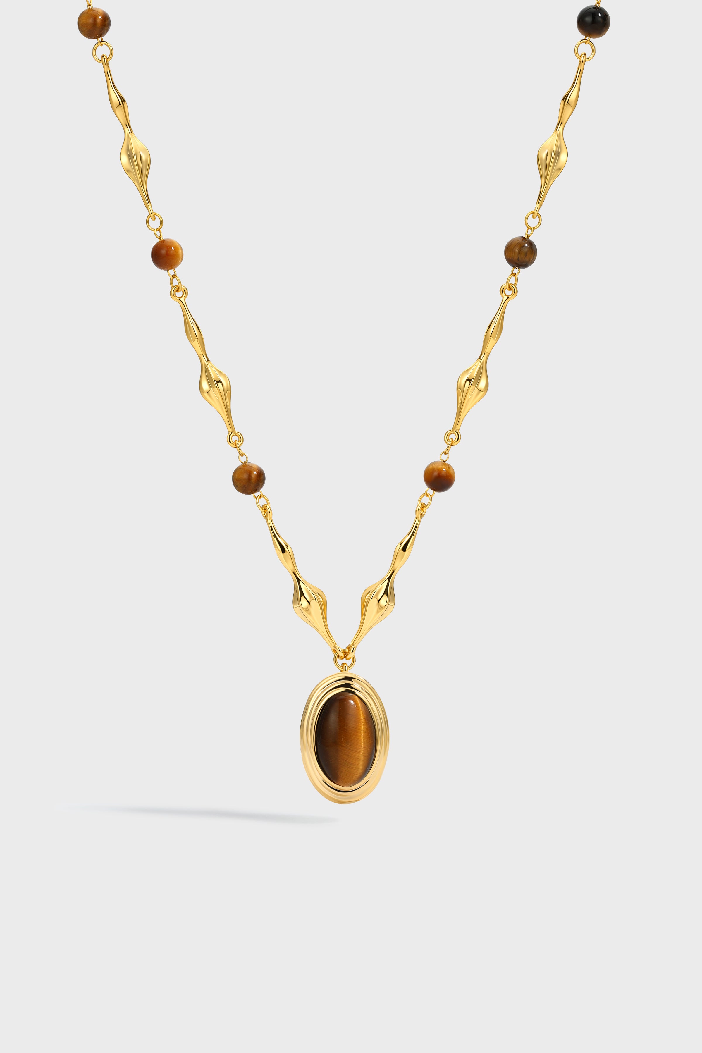 Rooted in the Maillard-inspired color palette, this design fuses the brown-golden gradient of Tiger Eye with a liquid gold sheen — creating a warm, grounded yet dynamic vintage jewelry piece for fall and winter.