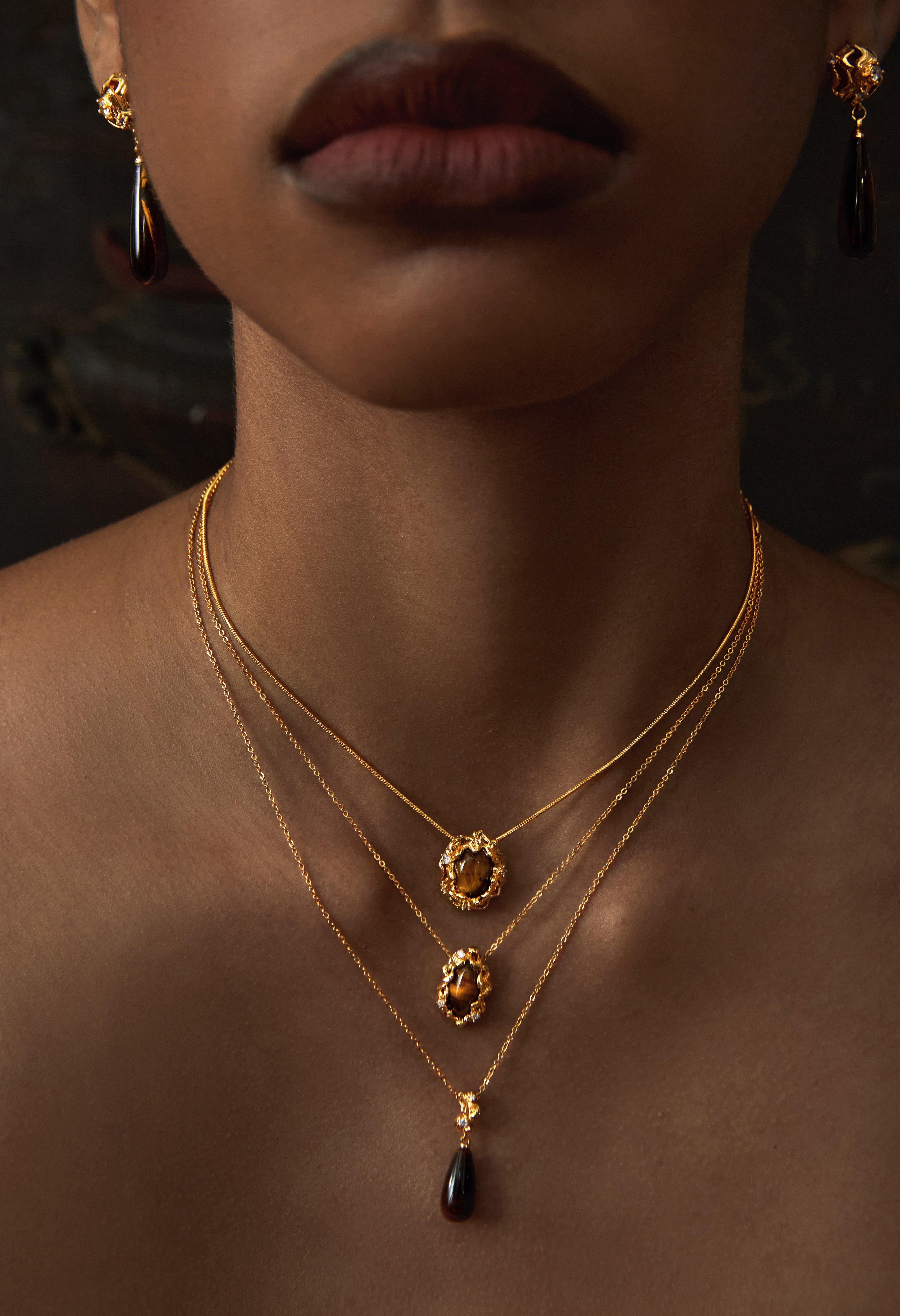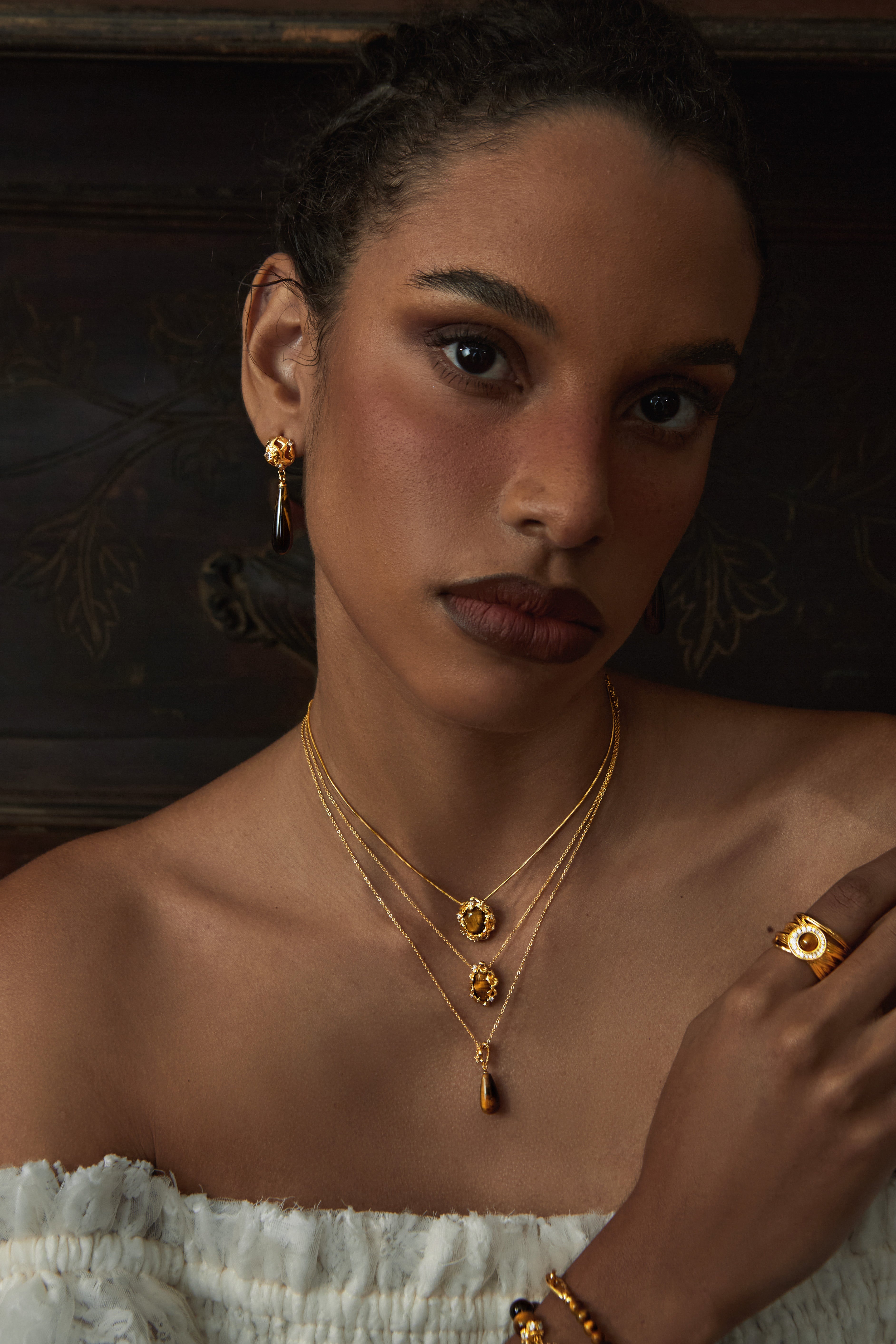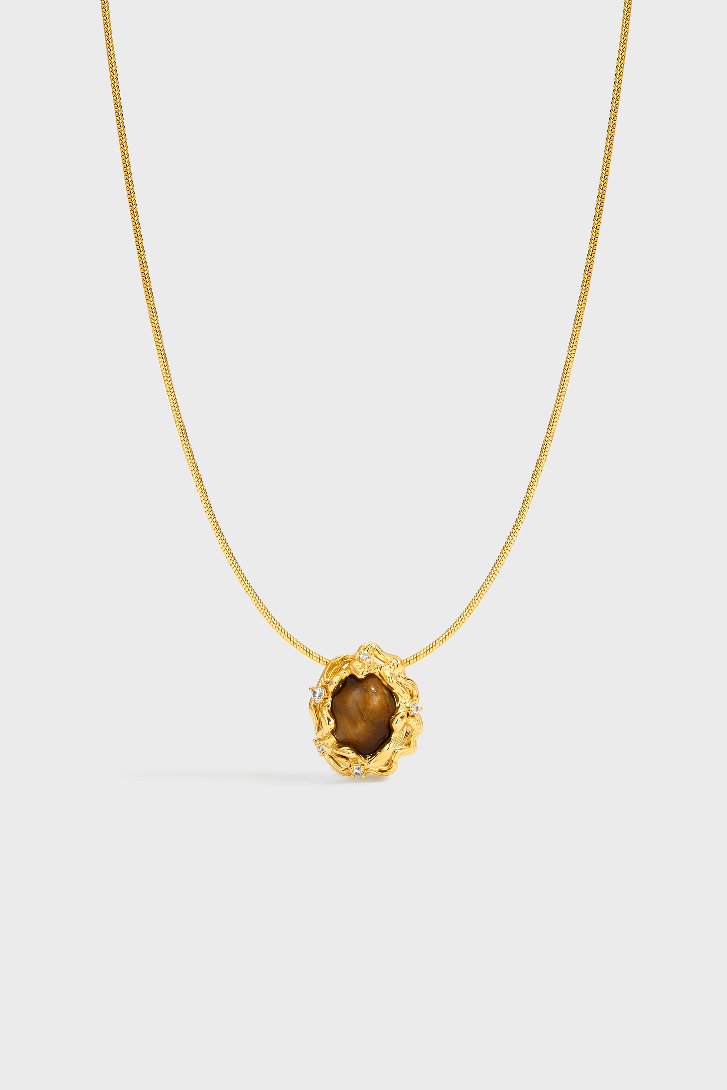 Rooted in the Maillard-inspired color palette, this design fuses the brown-golden gradient of Tiger Eye with a liquid gold sheen — creating a warm, grounded yet dynamic vintage jewelry piece for fall and winter.