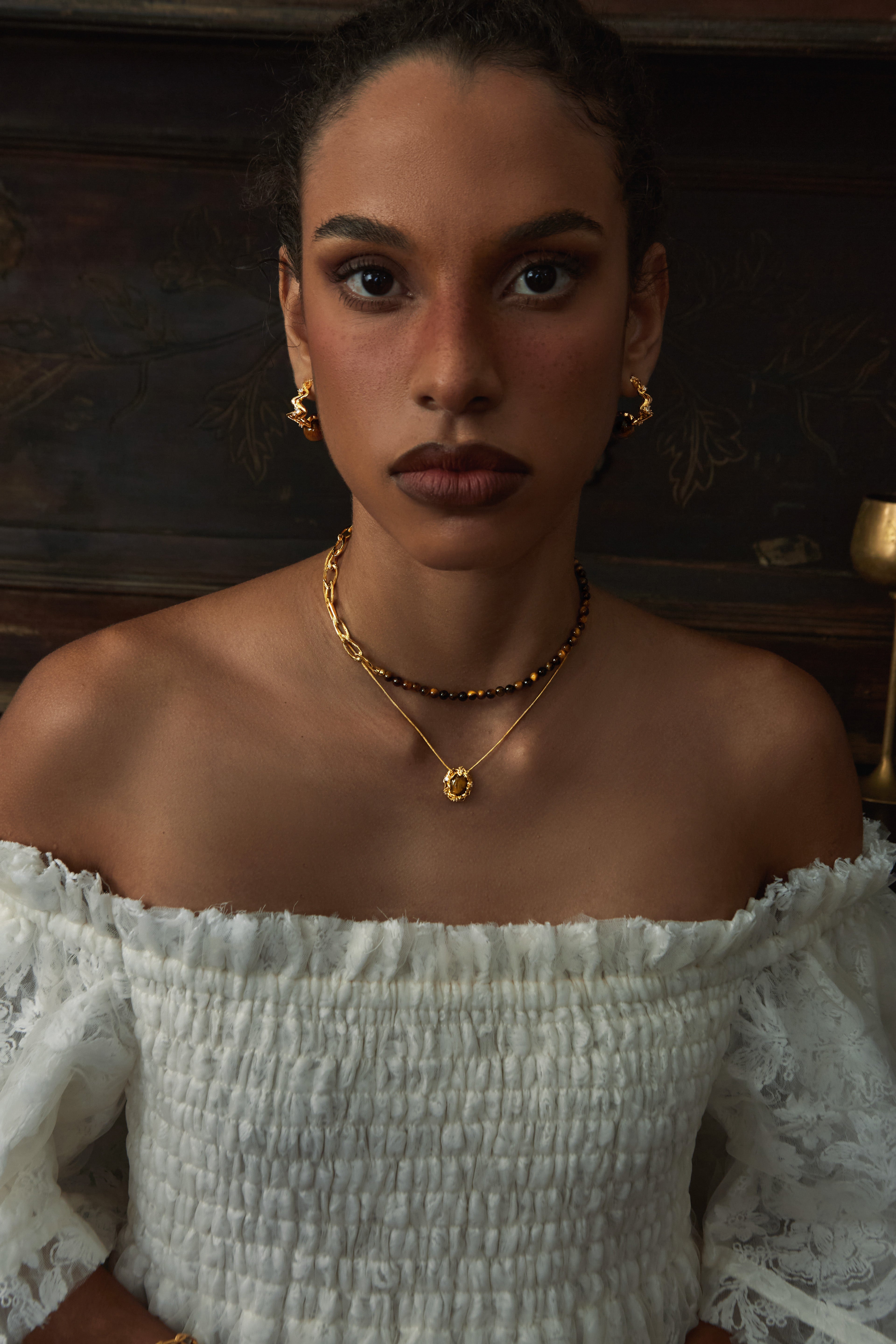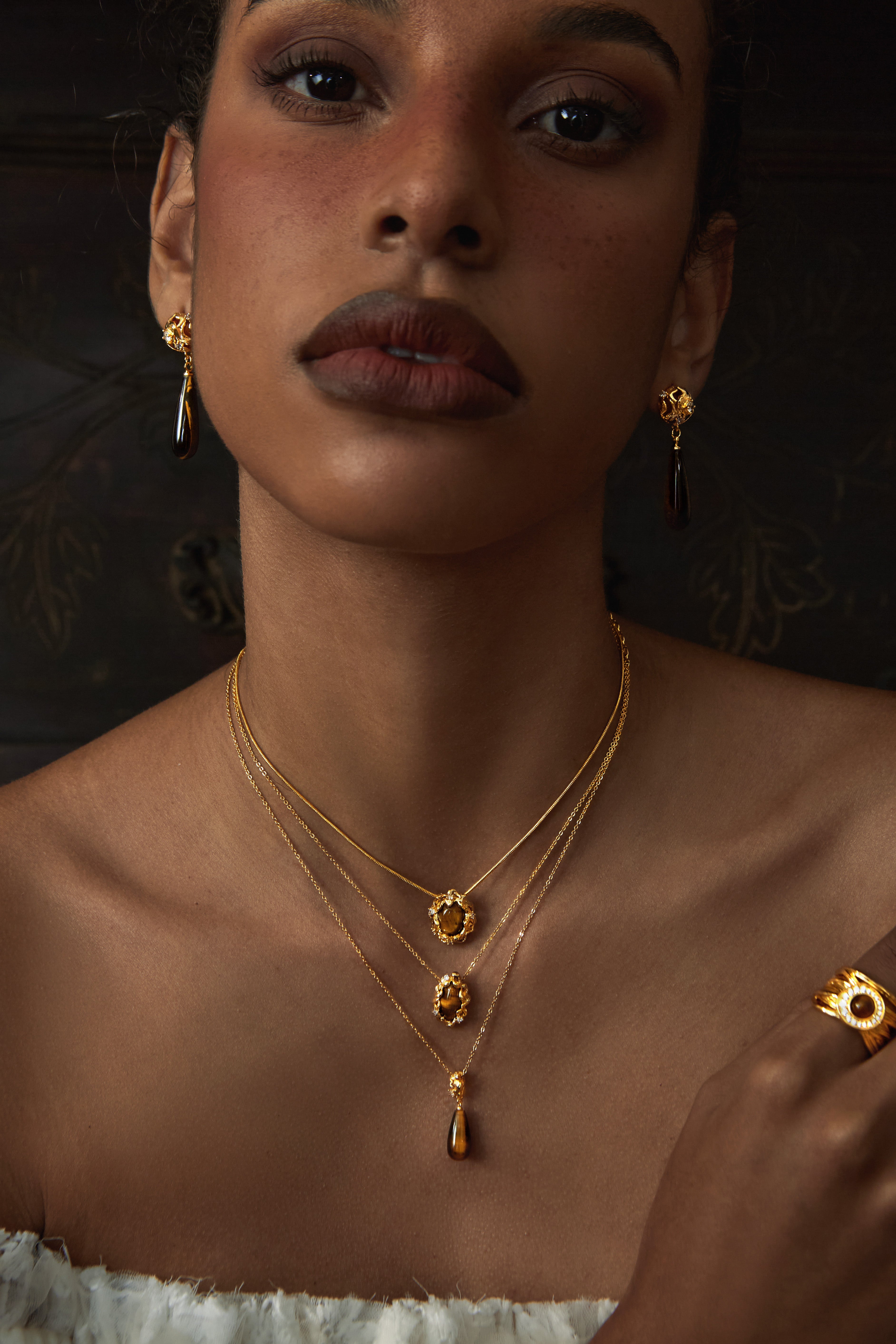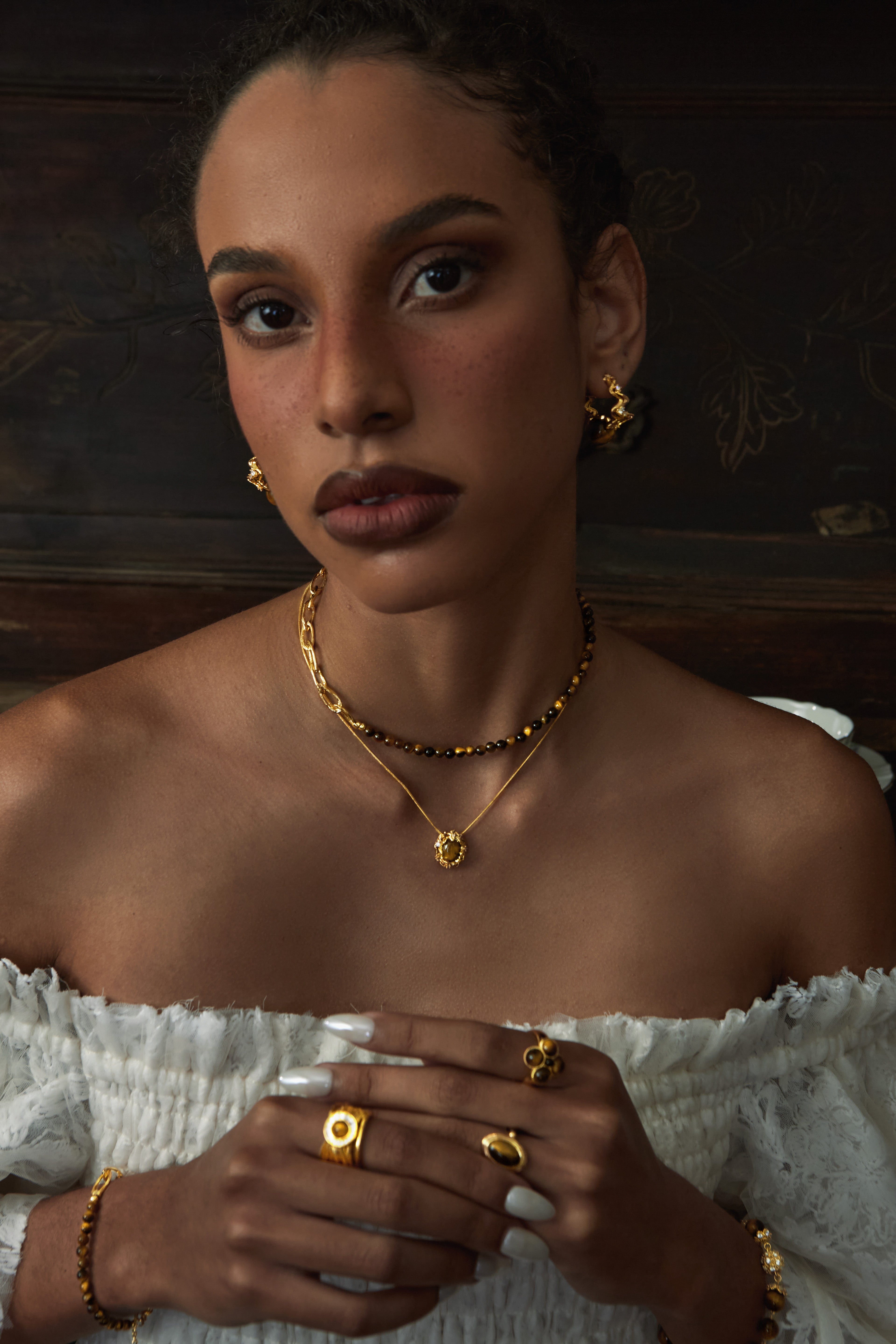 Rooted in the Maillard-inspired color palette, this design fuses the brown-golden gradient of Tiger Eye with a liquid gold sheen — creating a warm, grounded yet dynamic vintage jewelry piece for fall and winter.