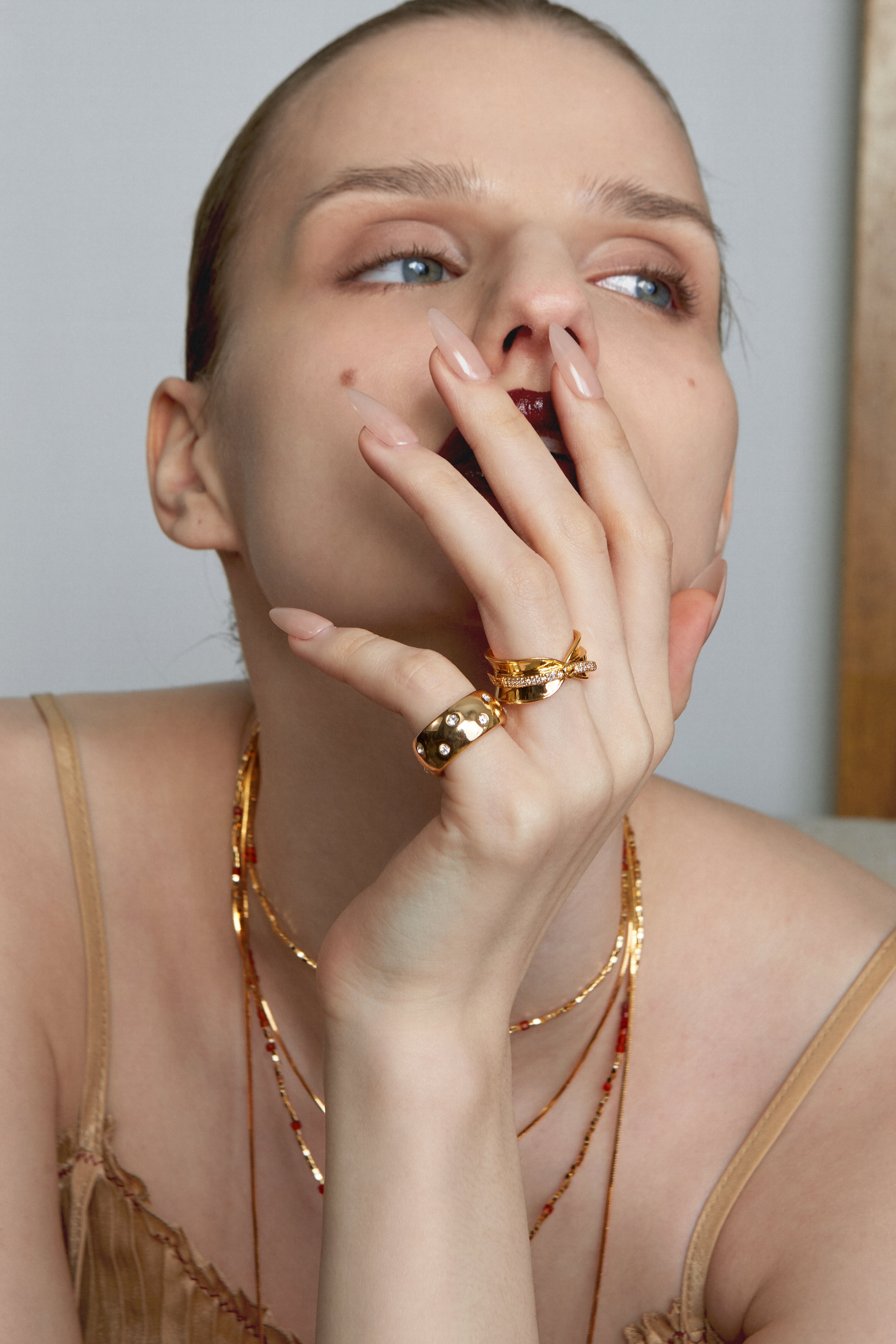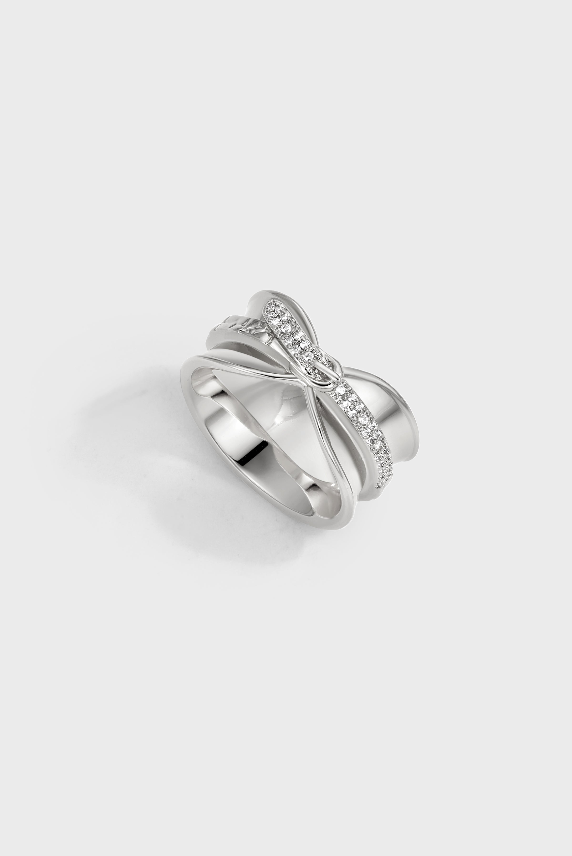 Hand-set cubic zirconia stones follow the natural contours of the design, softening the structured silhouette with flowing light. Even paired with simple outfits, the dimensional sparkle draws the eye and elevates the entire look.