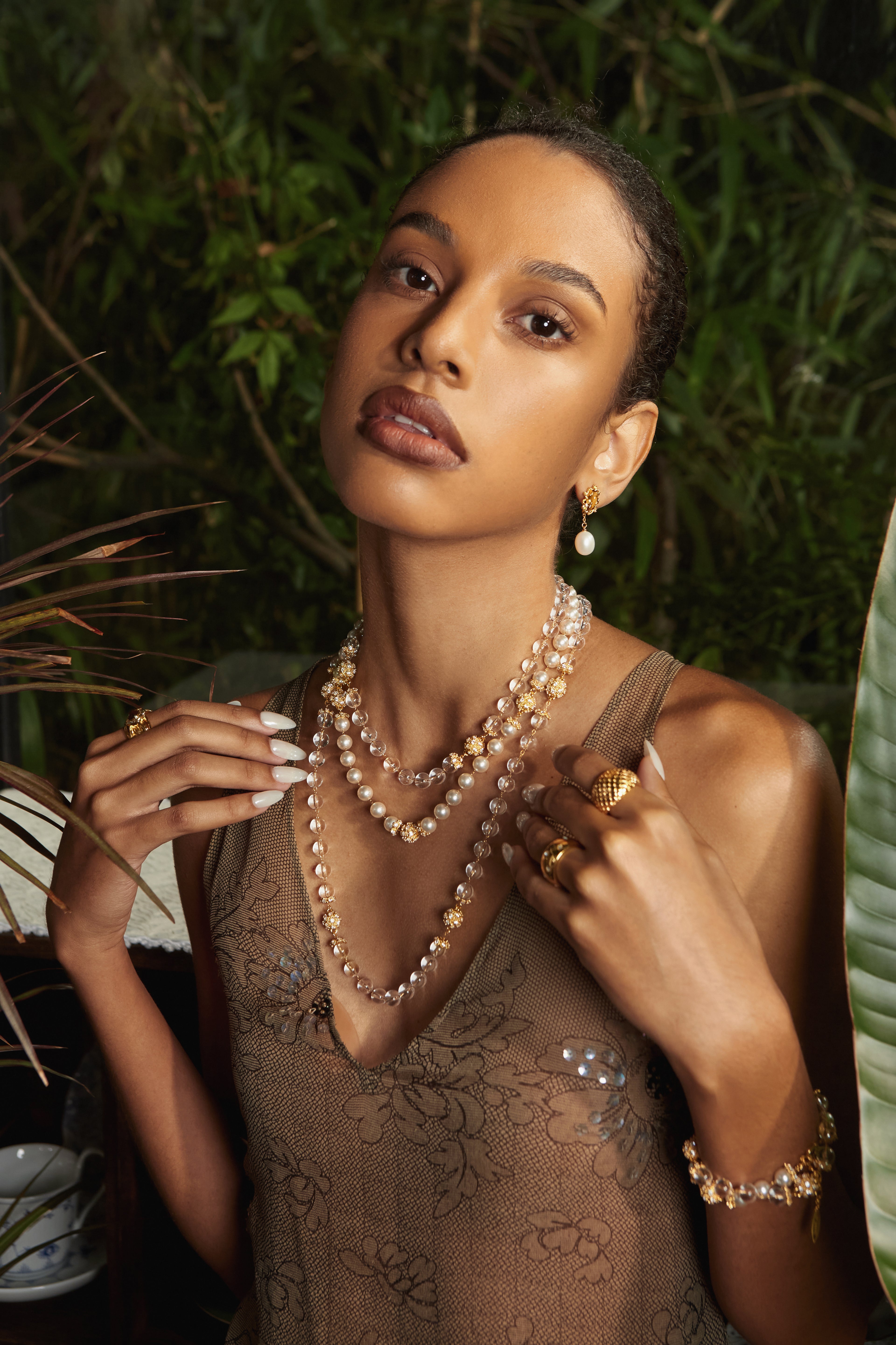 Rooted in a luminous, warm color palette, this design fuses faceted glass beads with a liquid gold sheen, accented with Cubic Zirconia — creating a radiant and dynamic vintage-inspired jewelry piece.