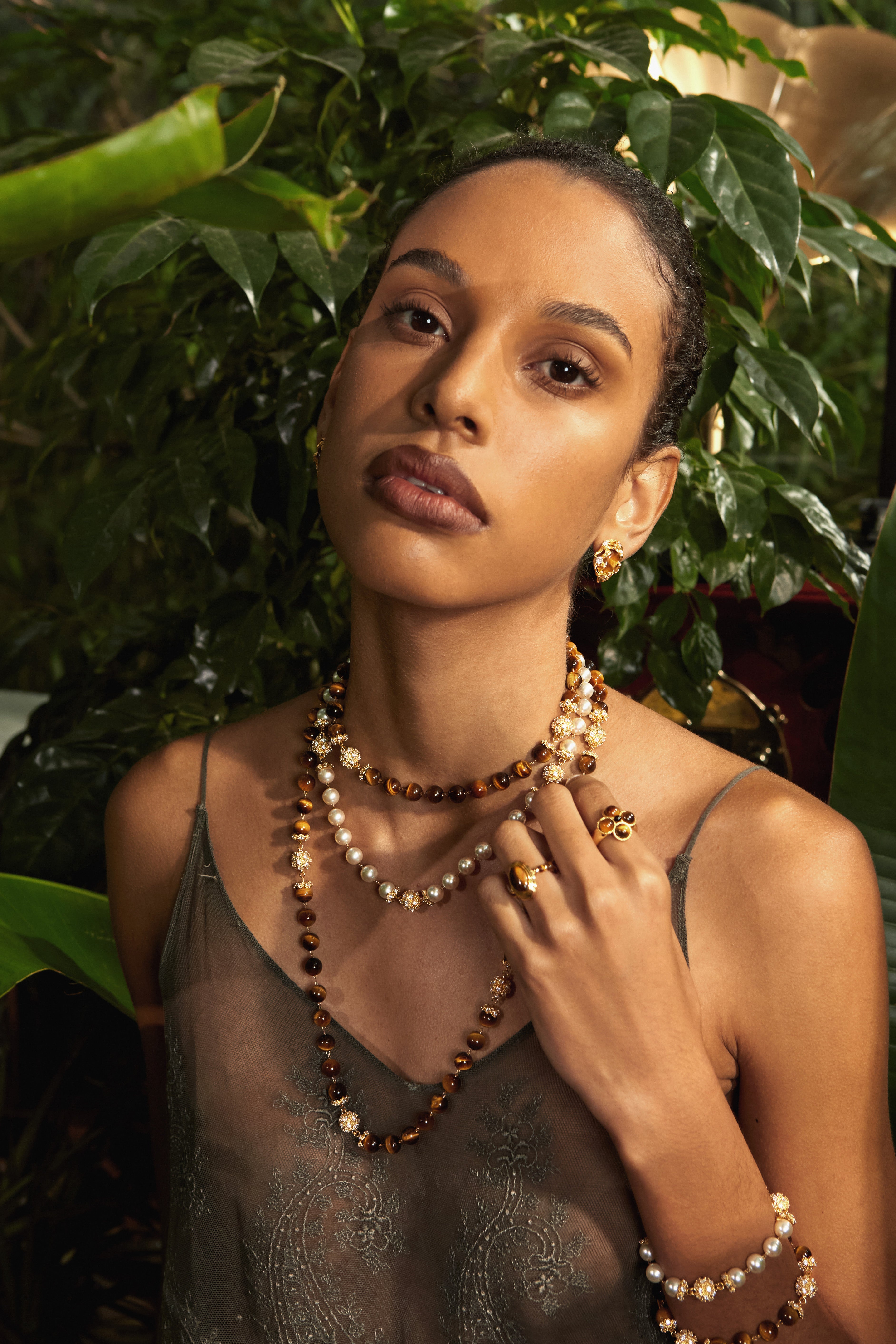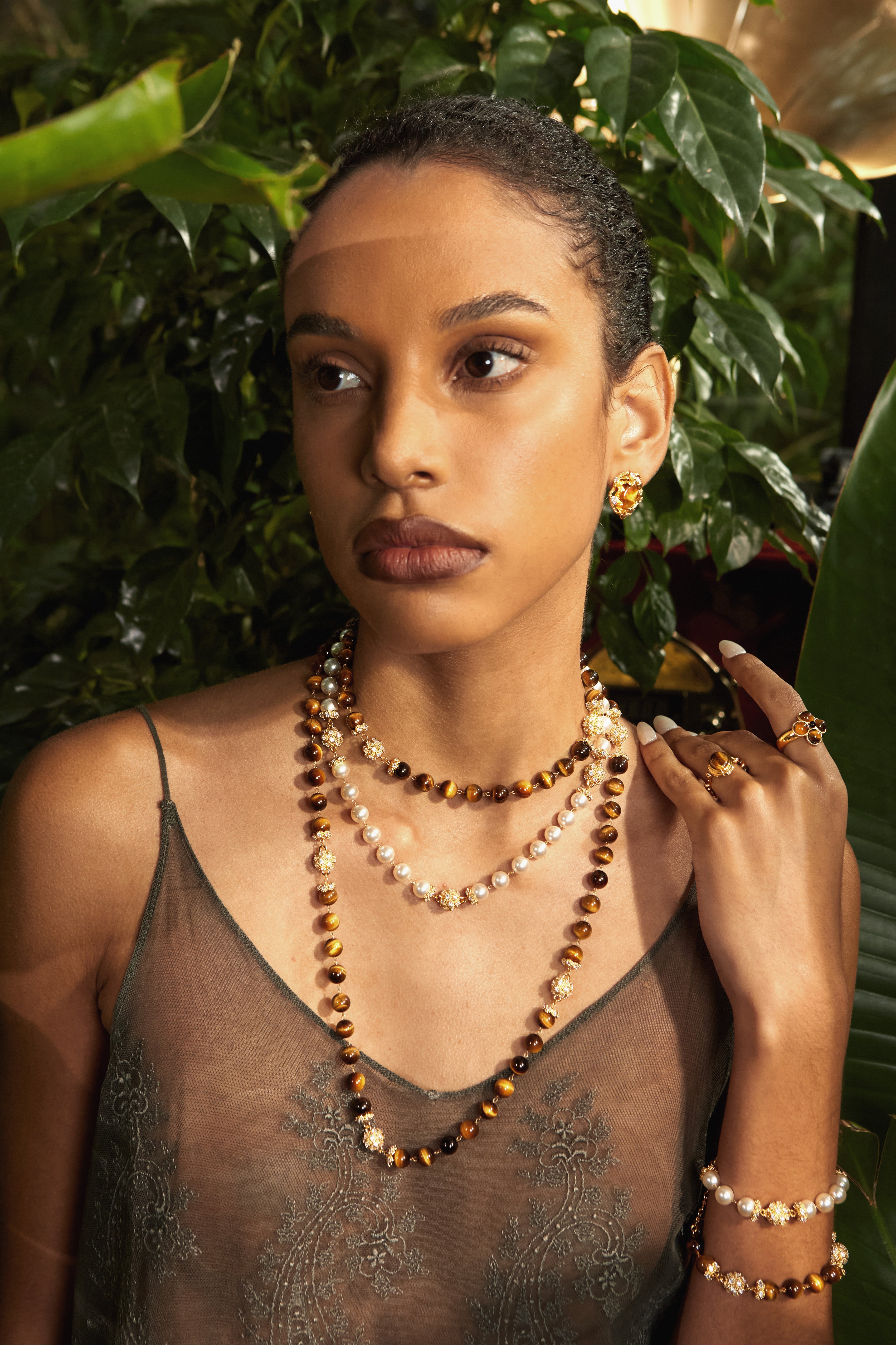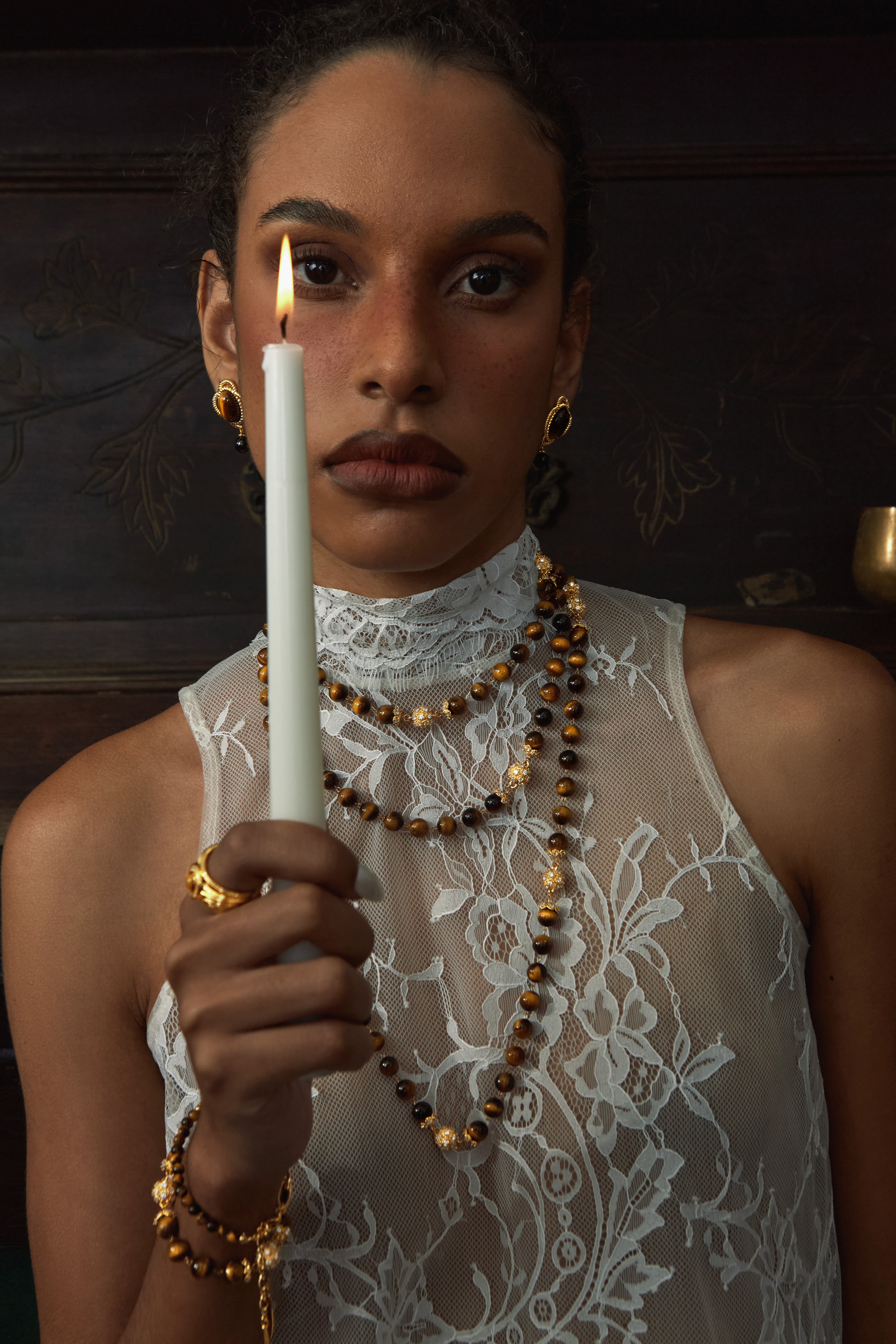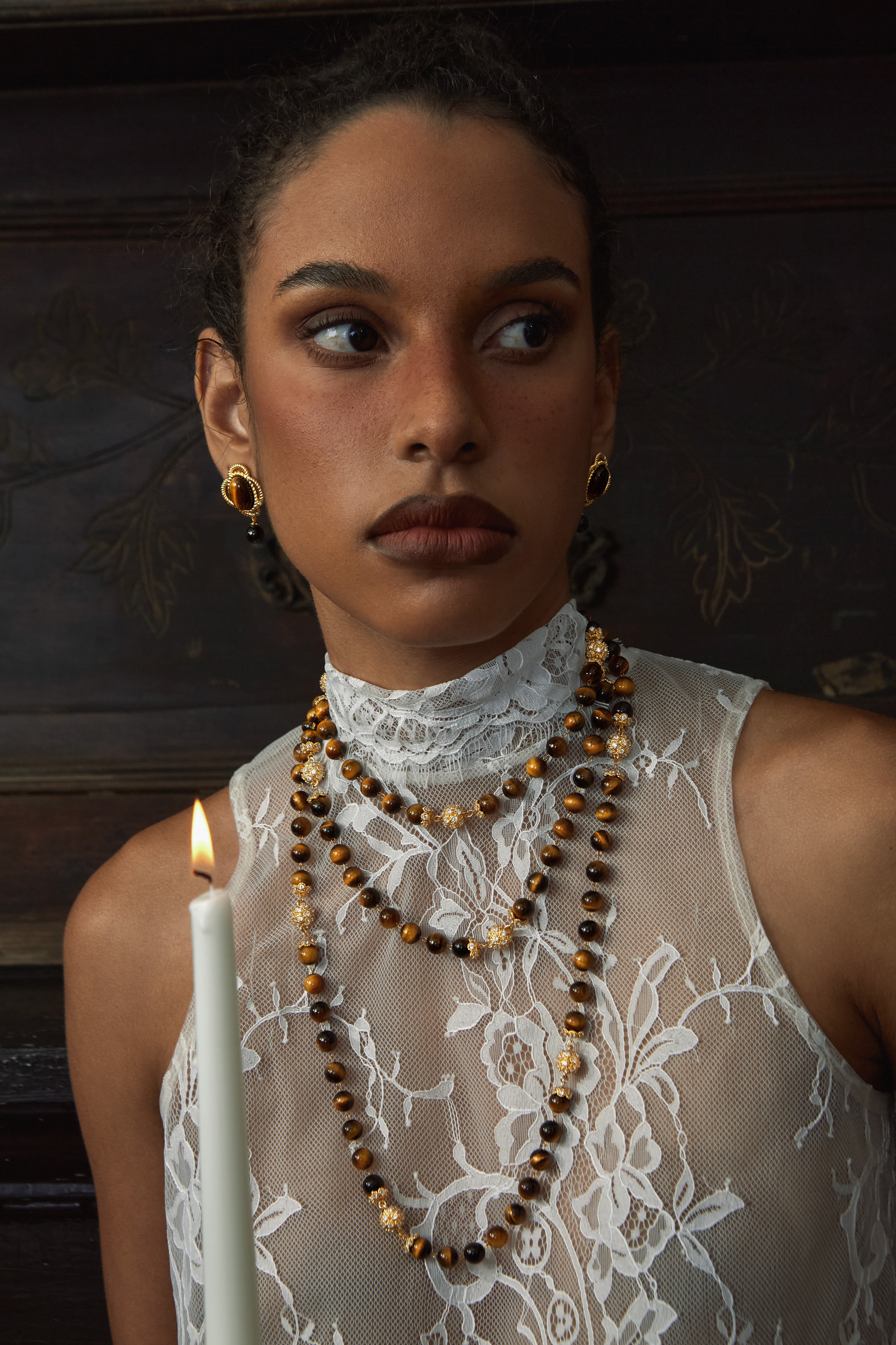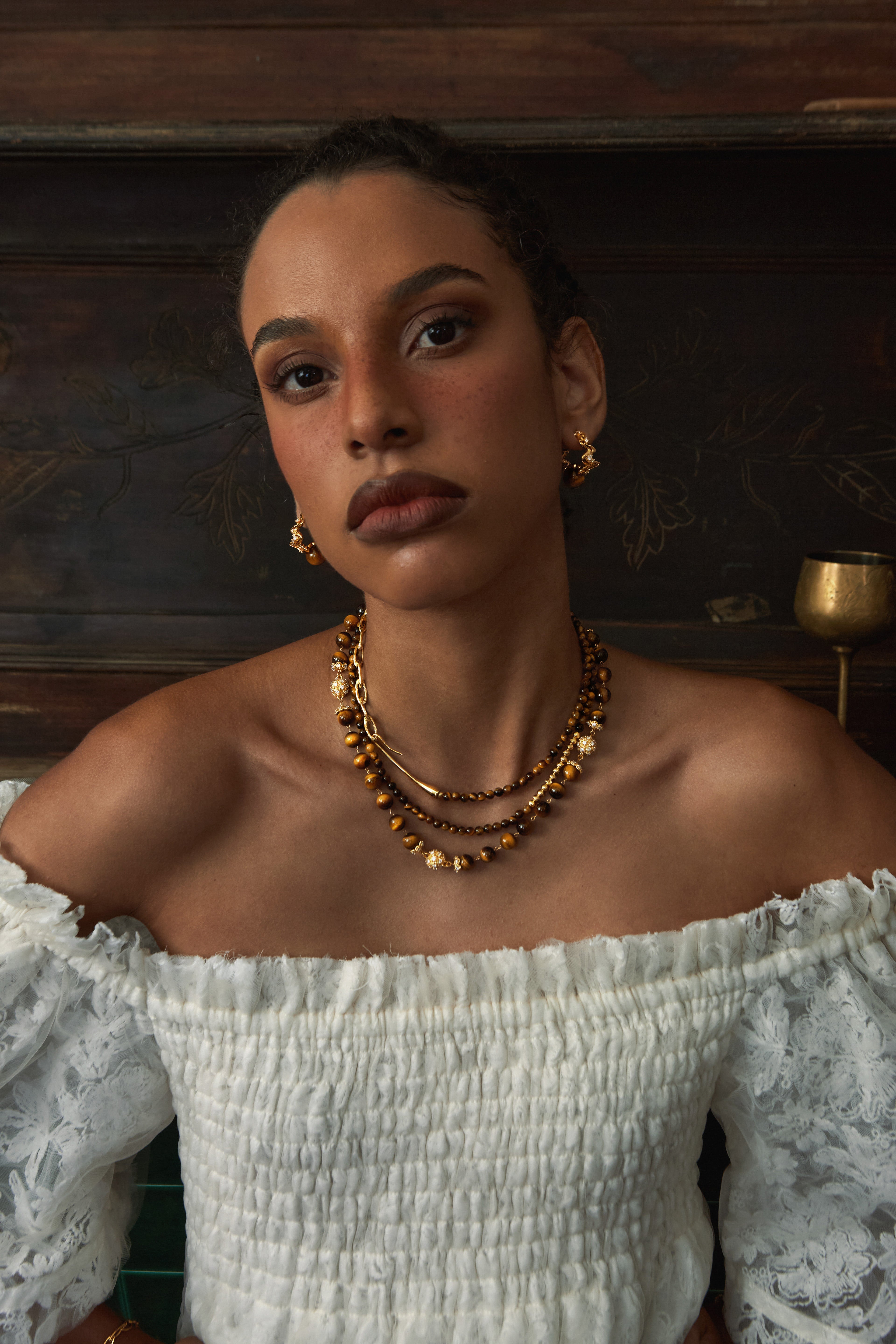 Rooted in the Maillard-inspired color palette, this design fuses the brown-golden gradient of Tiger Eye with a liquid gold sheen, accented with Cubic Zirconia — creating a warm, grounded yet dynamic vintage jewelry piece for fall and winter.