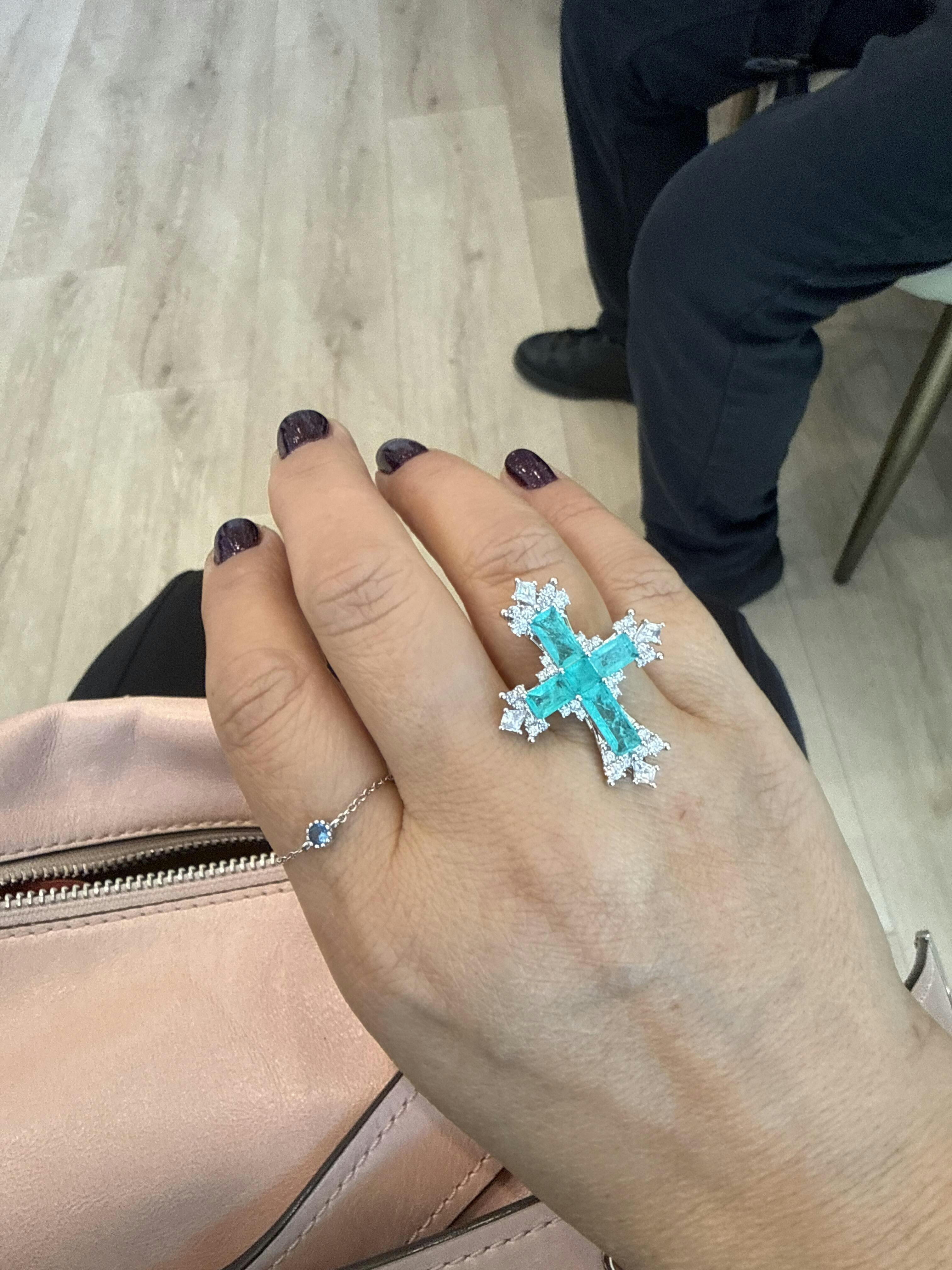 Inspired by the whispers of the deep sea and the cosmos, the neon blue of Paraíba ebbs like tides, while zirconia scatters like stardust, shaping the cross into a luminous beacon. It does not point to divine prophecy, but rather symbolizes a woman’s journey through darkness—each facet a tender yet unyielding edge, crafted for those who trust their intuition amidst chaos and rebuild worlds in silence.